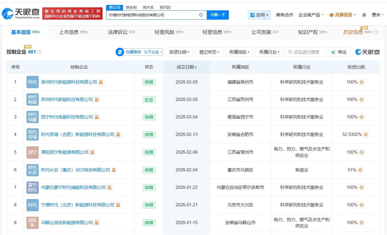 宁德时代今年成立超十家新公司 宁德时代实控百余家企业宁德时代日赚近2亿 据媒体报道,近日,宁德时代披露财报称,2025年归母净利润为722.01亿元,同比增长42.28%。 天眼查工商信息显示,宁德时代新能源科技股份有限公司成立于2011年12月,法定代表人为曾毓群,注册资本约44亿人民币,经营范围包括对新能源行业的投资,锂电池及相关产品的技术服务、测试服务以及咨询服务等。股东信息显示,该公司由厦门瑞庭投资有限公司、香港中央结算有限公司、黄世霖等共同持股。控制企业信息显示,该公司控制百余家企业,今年以来,该公司成立了泉州时代新能源科技有限公司、苏州时代新能科技有限公司等十余家新公司。 天眼查信息:
