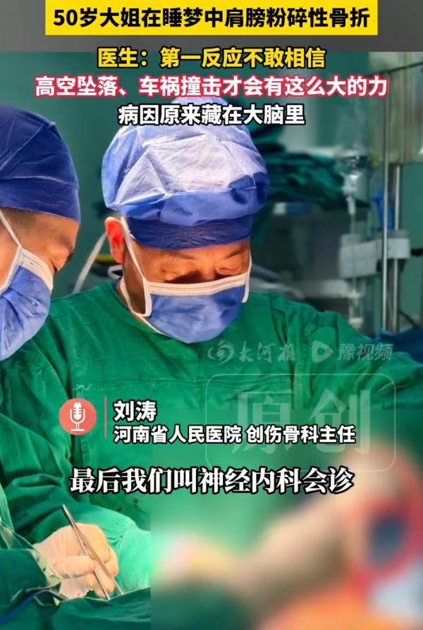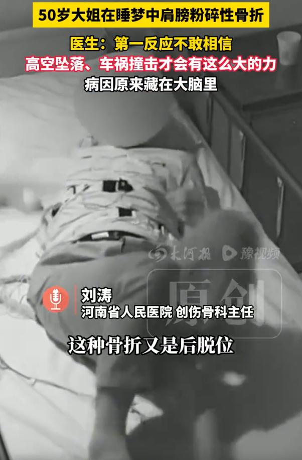 这下解释不清了!河南,一位50岁大姐肩膀粉碎性骨折,来到医院后,医生还以为是被车撞了,可家人告知大姐是在睡梦中骨折的,不仅家人觉得惊讶,就连医生第一反应都是不相信 那天凌晨三点多,她老公被一声闷响惊醒。扭头一看,张大姐嘴里哼了一声,整个人直挺挺躺着,右胳膊软塌塌搭在床边,怎么叫都不应。他伸手想把她胳膊挪正,刚碰到,张大姐疼得浑身一哆嗦,嗷一嗓子喊出来,人醒了,胳膊却抬不起来了 送到医院一拍片子,值班的骨科医生看了半天,抬头问:被车撞了?还是从楼上摔下来了? 片子显示,张大姐的肱骨头碎成了好几块,不仅劈裂,还往后脱位,连肩胛骨的关节盂都被撞出一个坑。这在骨科里叫Neer 4型骨折,属于最重的那一档 医生说这种伤,要么是高处坠落,要么是高速撞击,正常人在平地上摔一跤都摔不成这样 张大姐老公听得直摇头:没撞,没摔,就在床上睡觉呢。医生不信。睡觉能把肩膀睡碎? 可问了一圈,确实没什么异常。家里没车祸,没摔倒,没被人打,连猫都没压她一下。张大姐自己也想不明白,她就记得睡着睡着,突然脑袋嗡一下,后面的事全断片了 骨科先按常规查了一遍。骨质密度正常,不是骨质疏松。肿瘤标志物阴性,不是病理性骨折。外伤史为零,排除外力。查到最后,一群骨科大夫面面相觑:这伤,来路不明 后来神经内科的王医生过来会诊,听张大姐老公复述当时的情景:哼了一声,人僵住,四肢乱甩,醒过来头疼、恶心、浑身没劲。王医生听完就问了一句话:以前有没有过头疼、发愣、或者突然脑子空白的情况? 张大姐想了想,说有过,好几次了,都是白天干活干着干着,突然愣神几秒钟,别人叫她她也没反应,过一会儿自己就好了。她一直以为是累的,没当回事 王医生听完,直接开了一个脑电图。结果出来,所有人都愣住了,是癫痫。而且是发作在大脑运动中枢的那种,发作时肌肉会剧烈收缩,力量大到能把骨头拧断 这其实就能解释了,癫痫发作的时候,肌肉收缩的力量是正常用力的几倍甚至十几倍。有人发作时把牙咬碎,有人把舌头咬断,有人把脊椎拧骨折。张大姐那次发作,正好右侧上肢的肌肉猛地一抽,肱骨头硬生生被肌肉拽裂,撞在关节盂上 由此可见,一个是人体这事,远比我们想的复杂。肩膀疼,不一定是肩膀的事。骨折了,不一定是摔的。很多病藏在症状后面,你不扒开一层,永远不知道底下是什么 50岁女子在睡梦中粉碎性骨折