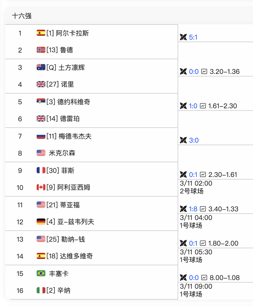 印第安维尔斯1000赛男女单16强阵容出炉🔥