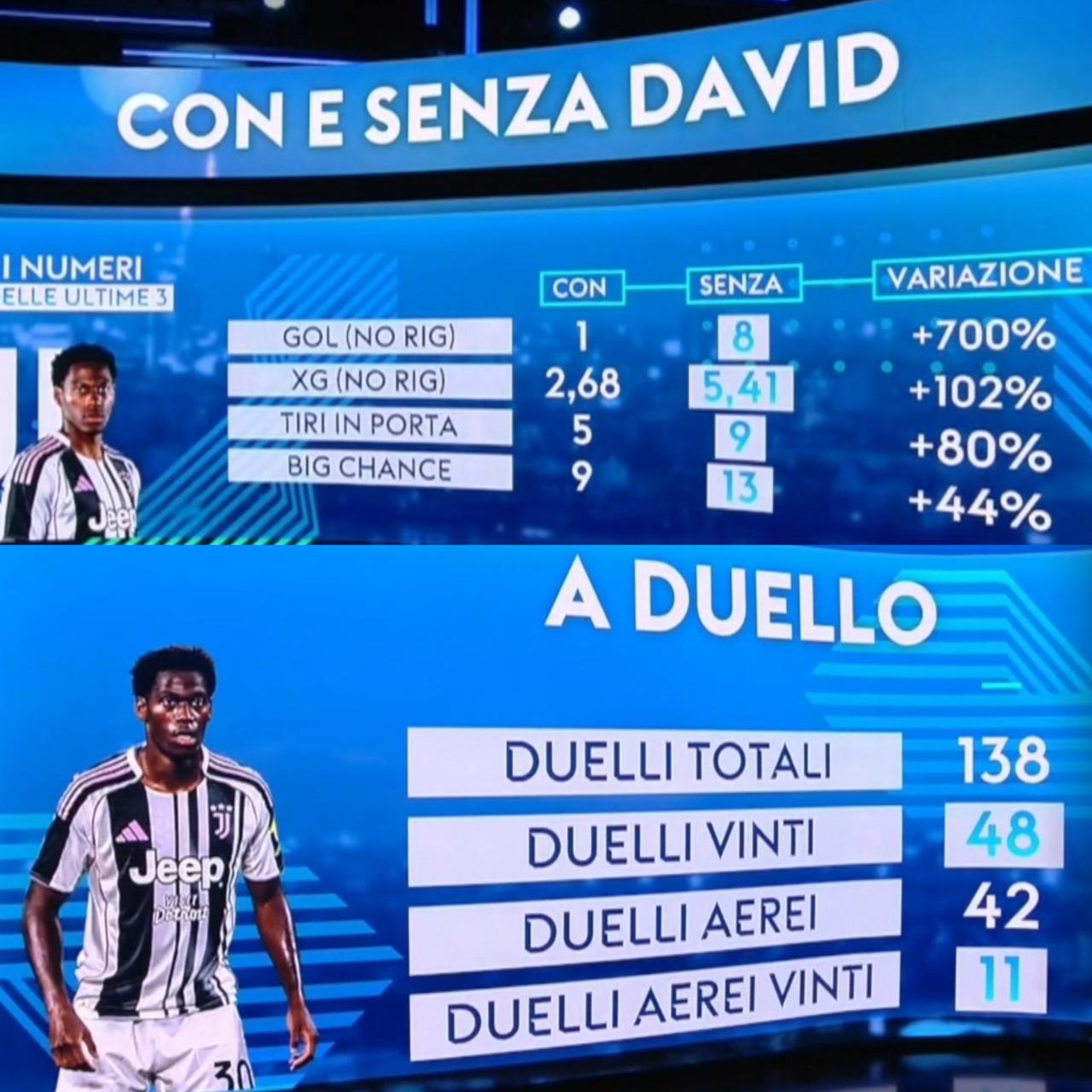 【天空体育是懂统计数据的】在过去三场比赛中,尤文图斯在缺少大卫的情况下进攻效率显著提升: 进球数从1个增加到8个(增长700%) 预期进球数(xG)从2.68个增加到5.41个(增长102%) 射正次数从5次增加到9次(增长80%) 创造绝佳机会的次数从9次增加到13次(增长44%)。 这些数据表明,在戴维不在场的情况下,尤文图斯的进攻效率更高