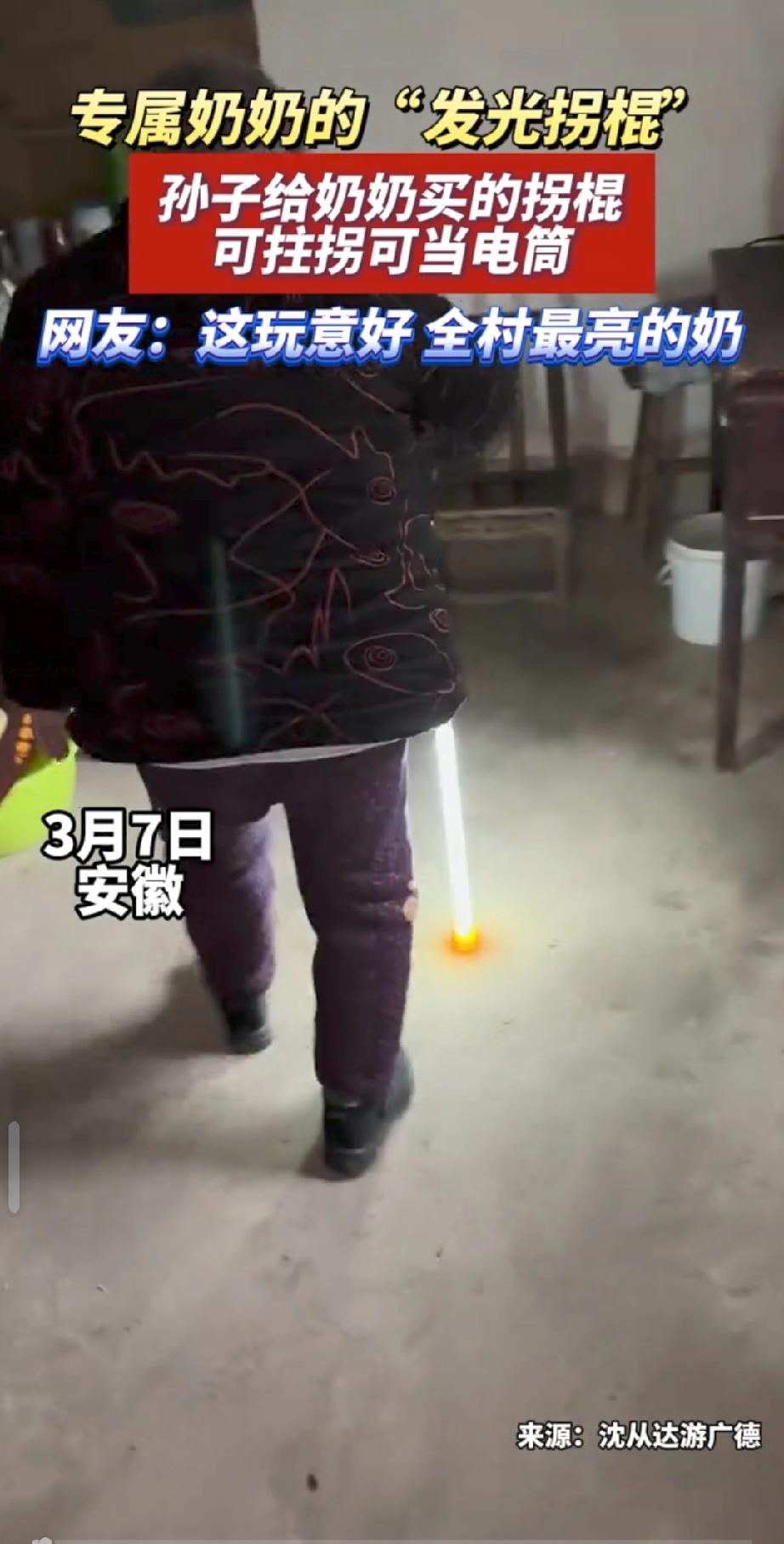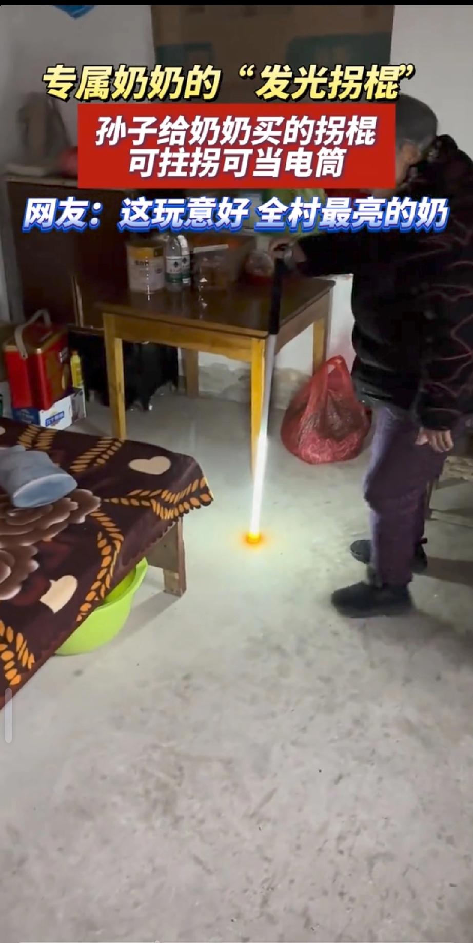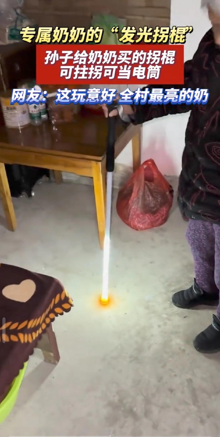 “笑不活了!”3月7日,安徽,一老人腿脚不利索,晚上出门总怕绊着,她随口和孙子说了这件事后,孙子随即给老人买了根“发光拐棍”,不仅能辅助老人行走,还自带照明功能,如今老人逢人就举着拐棍炫耀!网友:全村最亮的奶! 3月7日深夜,皖北某个破旧后罩房里,一声闷响砸在泥砖地上。一根两三米长的发光拐杖,就这么跌落在地,荡起一圈尘土。这玩意儿造价才一百来块钱,管材上装个发光体,底下配个防侧倾的底盘,高度还能自己调。看着简陋,但就是这么个东西,彻底改变了无数老人的命运。 几乎同一时间,河北邢台那个连路灯都没有的破村子里,24岁的小杨按下了发货键。他把这根发光拐杖,直接塞给了身边那个82岁、走路都颤巍巍的老人手里。老太接过拐杖的那一刻,半条腿算是保住了。 时间拉到今天,2026年3月10日。网上早就炸开了锅。“带外挂的拐杖"、"全村最亮的光",键盘侠们把所有煽情的词儿都往这根拐杖上堆。但说实话,撕掉那些滤镜,这根发光拐杖照出来的,不过是一群在黑暗里摸索了几十年、随时可能摔断骨头的老人罢了。 只要你出过城,去过那种连路灯都没有的农村,你就知道,对那些眼睛花了、腿脚不利索的老人来说,天一黑出门就是赌命。拿根木头拐杖撑着,或者扛根树枝当棍使,下雨天地一滑?直接摔断腿进棺材。这根发光拐杖,不到一顿饭钱,却像降维打击一样,把这个悬在老人头顶几十年的死亡威胁,一下子给砸碎了。 更绝的是,老人刚收到货的时候,还在骂:"败家玩意儿!烧钱的破烂!"结果按钮一按,黄光一亮到嘴边的抱怨全咽回去了,老人直接拿回了十几米的行动自由权。 这等于她拿到了一张"黑夜通行证"。现在,整个皖北、河北,所有收到拐杖的老人,每天傍晚必干一件事,拿着发光拐杖去村口最热闹的地方,逢人就晃:"看见没?我孙子给我买的!"你只要敢多看一眼,老太立马开启话痨模式,把拐杖往你眼前一杵:"这可是我孙子亲手给我挑的!" 小杨这波操作,压根没想立什么孝子人设。拿放大镜往前翻,从小到大,老人塞给他的那些补丁衣服、剩饭剩菜,还有挨欺负时替他挡下的那些拳头 这根拐杖,不过是还债罢了。这是对那些"虚情假意送温暖"最狠的一记耳光。锁定那些自媒体的报道你就明白了,所有人破防的点,都在这儿,那些过剩的表演、虚假的孝顺、只会感动自己的空壳子,全被这根一百块的拐杖给掀翻了。 不走夜路、不管老人摔不摔、不看黑灯瞎火的危险,光在那儿喊"我孝顺"有个屁用?那种自我感动的虚幻大楼,早该塌了。所以几十块钱换两米光亮、换老人的安全,才是真正的关怀,用最小的成本,狠狠砍掉了一群"表演型孝顺"的遮羞布。
