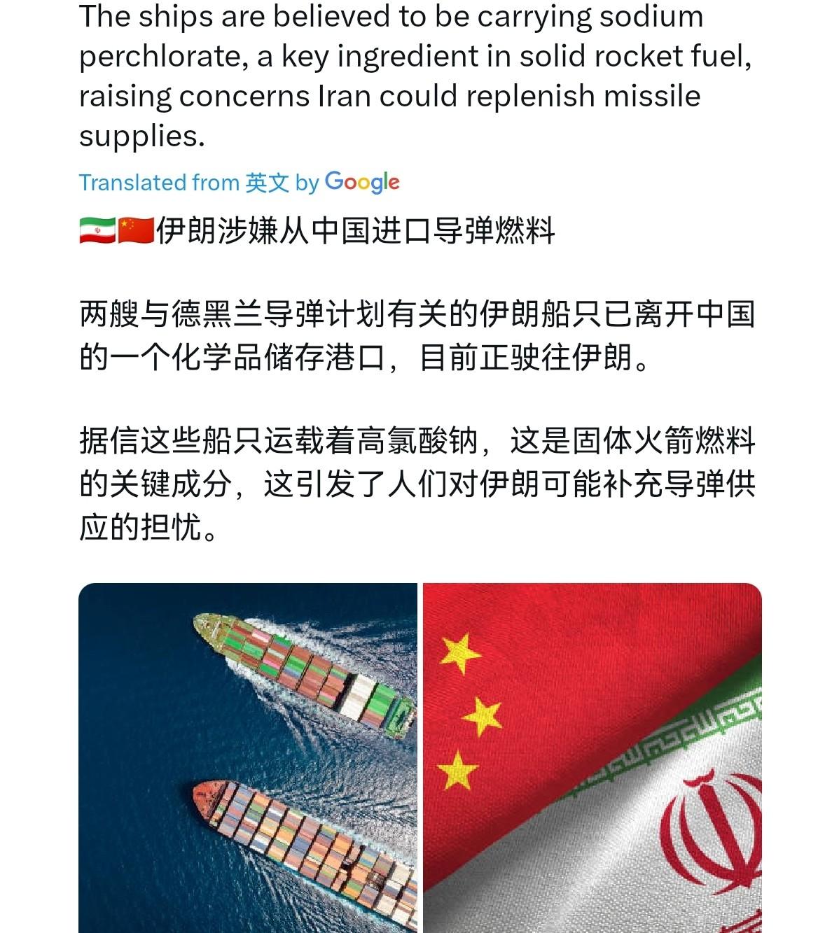 伊朗紧急从中国进口导弹燃料? 3月9日,外媒报道称,与德黑兰导弹项目有关的两艘伊朗船只已经离开中国的一个化学储存港口,目前正驶往伊朗。外媒称,这些船只携带了高氯酸钠,这是固体火箭燃料的关键成分,这引发了人们对伊朗可能补充导弹供应的担忧。 说实话,外媒这番说辞看似言之凿凿、有理有据,实则危言耸听,大概率就是一场精心策划的炒作。 当下美以对伊朗的军事打击已经进入第九天,以军累计发动超过3400次空袭,重创伊朗导弹生产基地,在这样的敏感时刻,外媒突然抛出这样的消息,很难让人相信没有别的心思。 更值得注意的是,所谓“伊朗船只携带高氯酸钠用于导弹燃料”的说法,至今也没有任何直接证据,全是外媒根据船舶历史航线的主观推断得。 事实上,高氯酸钠根本不是什么“导弹燃料专属品”,它是典型的军民两用化学品,既能用于固体火箭燃料的生产,更广泛应用在民用工业的各个领域。 根据国家市场监督管理总局和中国国家标准化管理委员会发布的标准,工业高氯酸钠主要用作生产高氯酸及其他高氯酸盐的原料,还能用于安全火柴、民用引火煤、化工合成、分析试剂等多个民用场景,日常工业生产中随处可见。 也就是说,不能因为它能用于火箭燃料,就武断地认定伊朗进口它就是为了补充导弹,这就像不能因为钢铁能制造武器,就说所有进口钢铁的国家都是在备战一样。 更关键的是,联合国制裁清单里,从来没有明确禁止高氯酸钠的进出口。联合国安理会相关决议只是要求各国对与伊朗导弹及核计划相关的“双用途物项”运输保持警惕,有权对涉嫌违规的船舶进行检查,但这并不意味着高氯酸钠本身就是违禁品。 事实上,高氯酸钠的进出口,只要符合国际惯例和各国相关规定,就是完全合法合规的商业行为,外媒故意忽略这一点,只强调其军事用途,就是为了误导大众,制造恐慌。 结合当下的局势,外媒此时散播这样的消息,简直是别有用心到了极点。 目前美以持续加大对伊朗的打击力度,美军击沉伊朗多艘舰艇,以色列更是空袭了伊朗多处军事目标,地区局势已经极度紧张。而伊朗方面也明确表示,将坚决捍卫国家主权,任何美以资产都是合法打击目标,双方的对峙一触即发。 就在这个时候,外媒炒作“中国向伊朗出口导弹燃料相关成分”,一方面是想抹黑中国的国际形象,给中国扣上“支持冲突”的帽子;另一方面,也是想渲染伊朗“扩军备战”的假象,为美以进一步加大对伊朗的打击力度寻找借口。 说到底,这则报道就是外媒在美以打击伊朗的背景下,精心炮制的虚假噱头。他们故意放大高氯酸钠的军事用途,忽略其民用属性和合法进出口的事实,目的就是搅乱舆论、加剧地区紧张局势。 在复杂的国际局势中,我们更应该保持清醒的判断,不被虚假信息误导,才是最关键的。