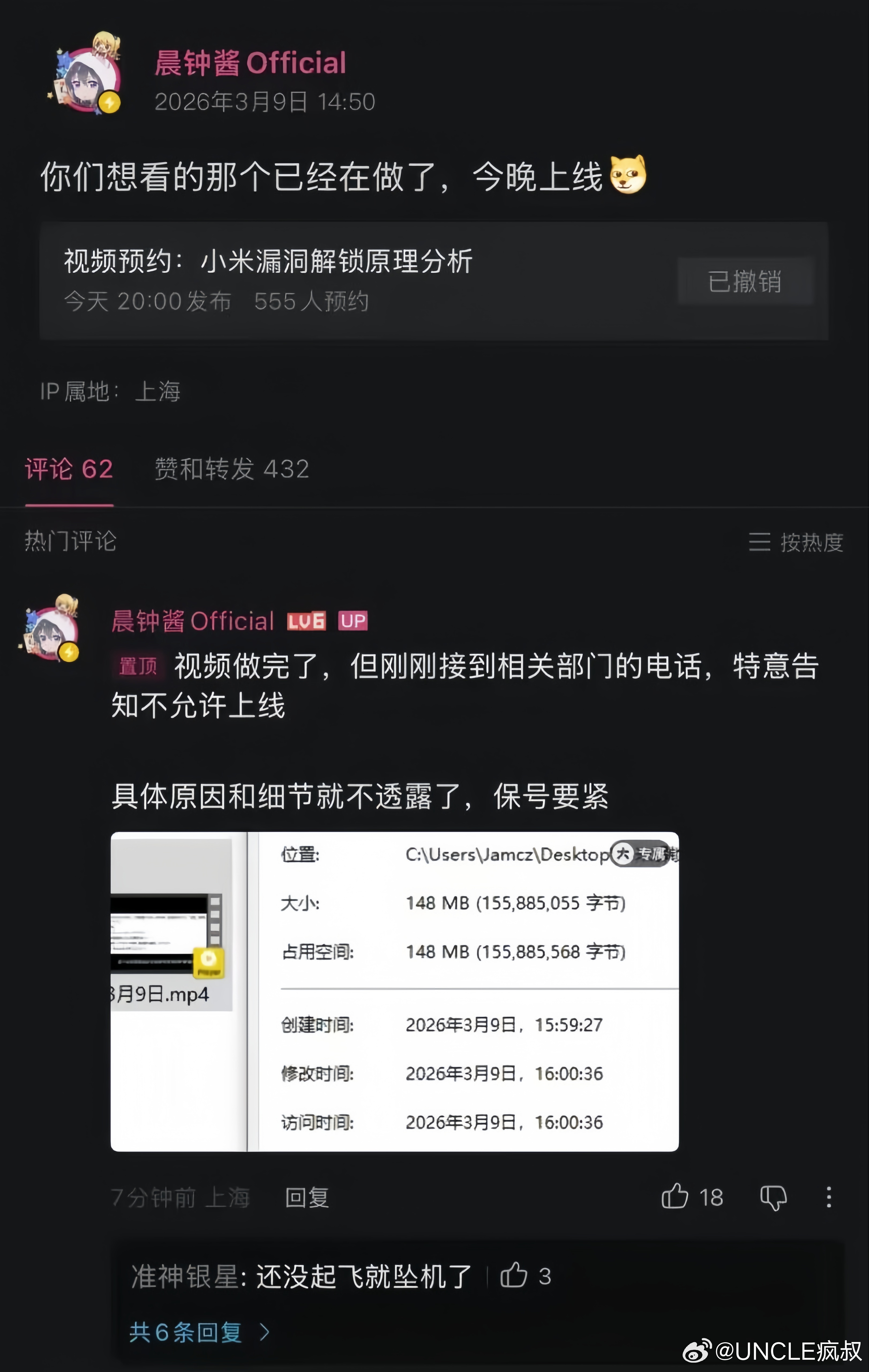 B站up“晨钟酱Official”原定昨晚20:00发布《小米漏洞解锁原理分析》,后在动态称视频已制作完成,但接到“相关部门”电话,明确不允许上线,未说明具体原因,并称这是“保号”,目前该动态已删除。