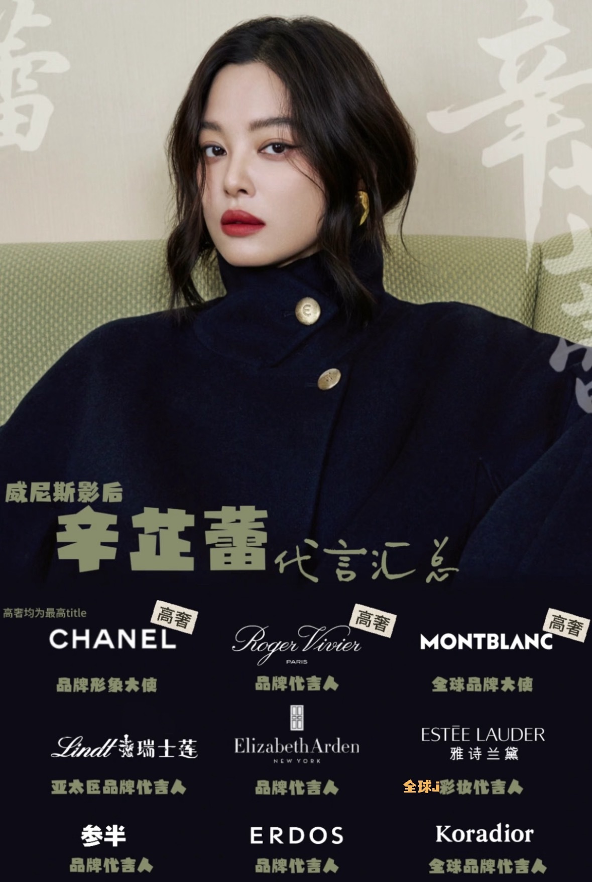 汇总一下蕾子的高端代言1、Estée Lauder 雅诗兰黛全球彩妆代言人2、CHANEL 香奈儿品牌形象大使3、MONTBLANC 万宝龙全球品牌大使4、Elizabeth Arden伊丽莎白雅顿品牌代言人5、Roger Vivier 全球品牌代言人6、ERDOS 鄂尔多斯品牌代言人7、Koradior 珂莱蒂尔全球品牌代言人8、Lindt 瑞士莲亚太区品牌代言人