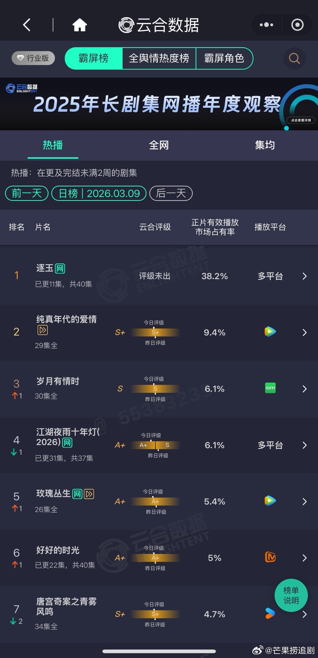 《逐玉》云合占比38.2%,本剧粉爽到!!!