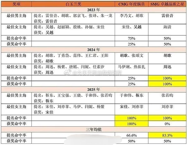 其实“白玉兰前哨奖”的说法并不算空穴来风,广 电、cmg、smg都是白玉兰的主办方之一,对评奖的话语权很大根据今年的评奖记录,孙俪三提三中,肖战三提两中,杨幂、于和伟两提两中。 从中也可以看出业内的预期,现在也被网友看作是这届白玉兰的种子选手肖战 黄金时代杨幂连续五年为刘诗诗庆生