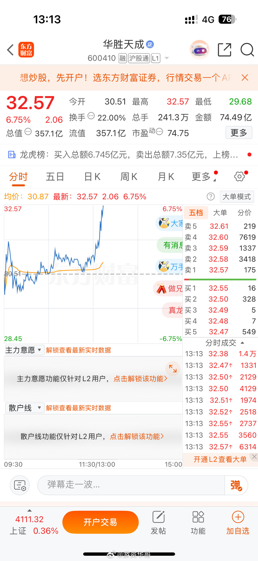 实盘上车,华胜天成600410支持我的朋友点赞👍打888,个人记录,请勿盲目跟