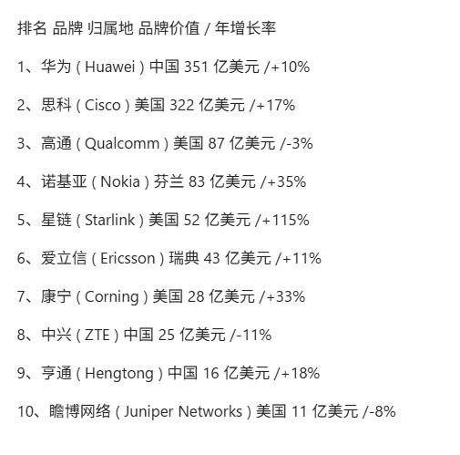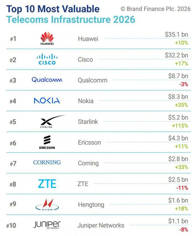 2026全球通讯基础设施品牌价值10强出炉,华为蝉联榜首,思科第二名,高通第三名,星链升至第五名。 中国有3家公司上榜,除了华为外,还有中兴与亨通。