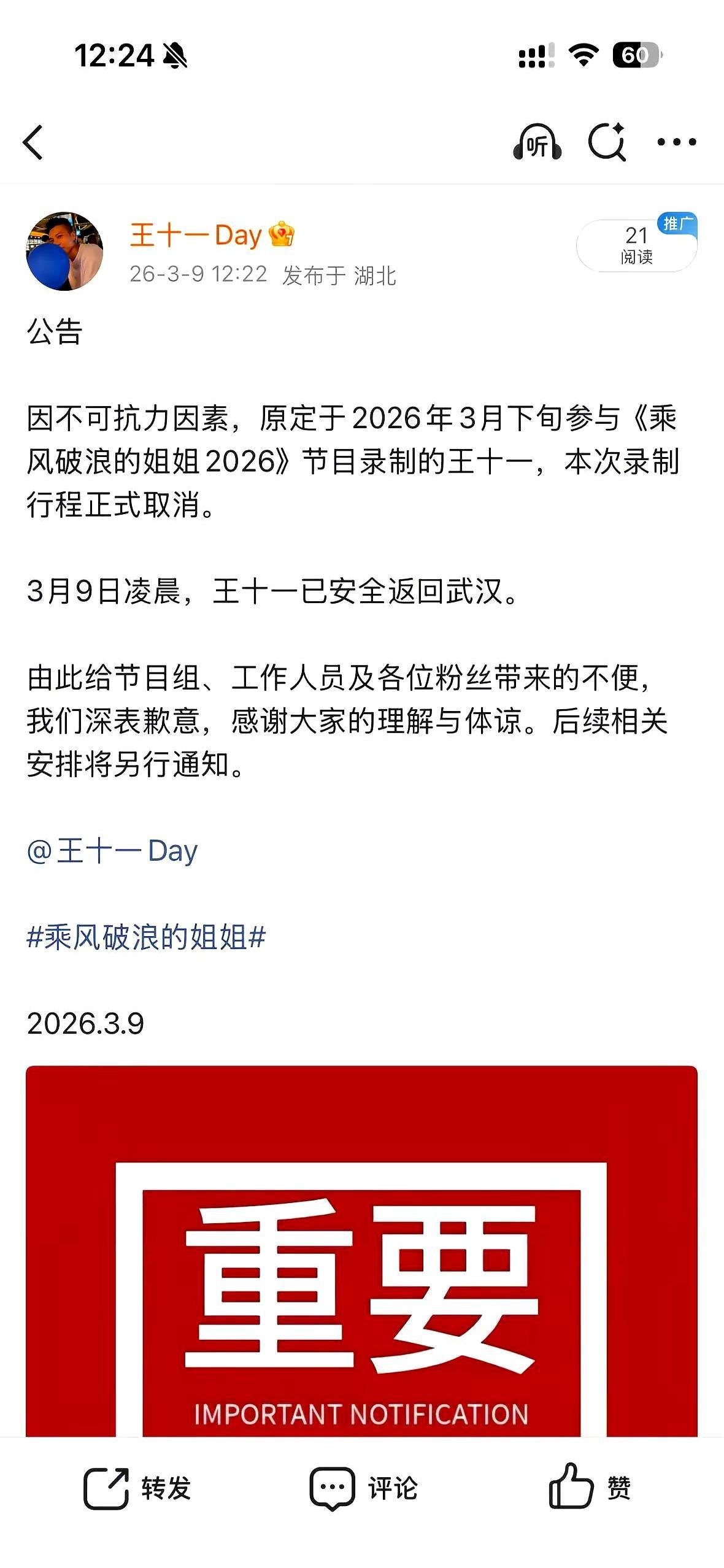 蹲王十一浪姐7舞台的,别等了。 3月9号官方刚发公告,她因为不可抗力取消录制行程,现在已经安全回到武汉,后续安排还没通知。 这次浪姐7拟邀名单本来呼声极高,萧蔷、温峥嵘、王濛、谢楠都在列,不少人专门等着看她和各路姐姐同台PK。 目前没公开不可抗力的具体原因,节目筹备期临时调整艺人很常见,最终录制名单大概率还要改。 真想等她新舞台的,直接蹲她个人动态更准。