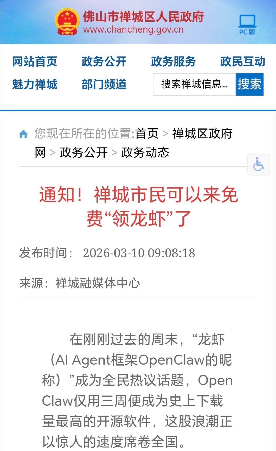 【#佛山禅城区免费帮市民装小龙虾# 】3月10日,佛山市禅城区政府官网刊发禅城区政务服务和数据管理局消息称,在刚刚过去的周末,“龙虾(AI Agent框架OpenClaw的昵称)”成为全民热议话题,OpenClaw仅用三周便成为史上下载量最高的开源软件,这股浪潮正以惊人的速度席卷全国。