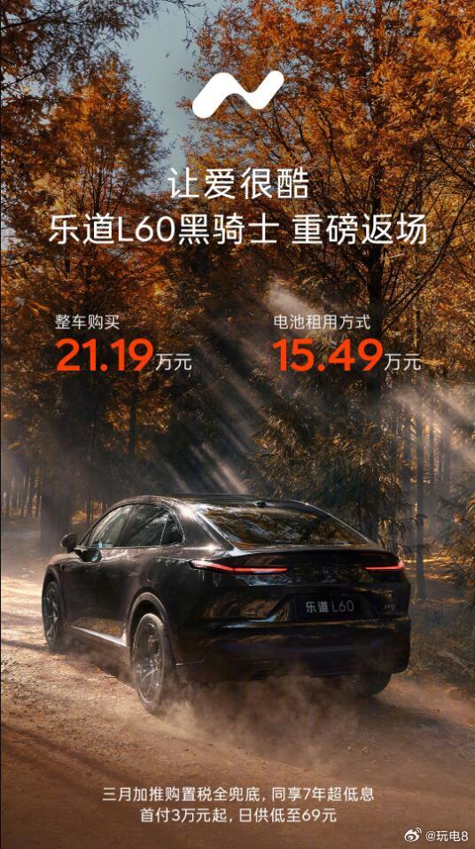 乐道L60 的黑骑士版开启返场,整车21.19万,上BaaS的话车子本体15.49万(和去年年底那次一样),预计这个月中下旬开启交付。