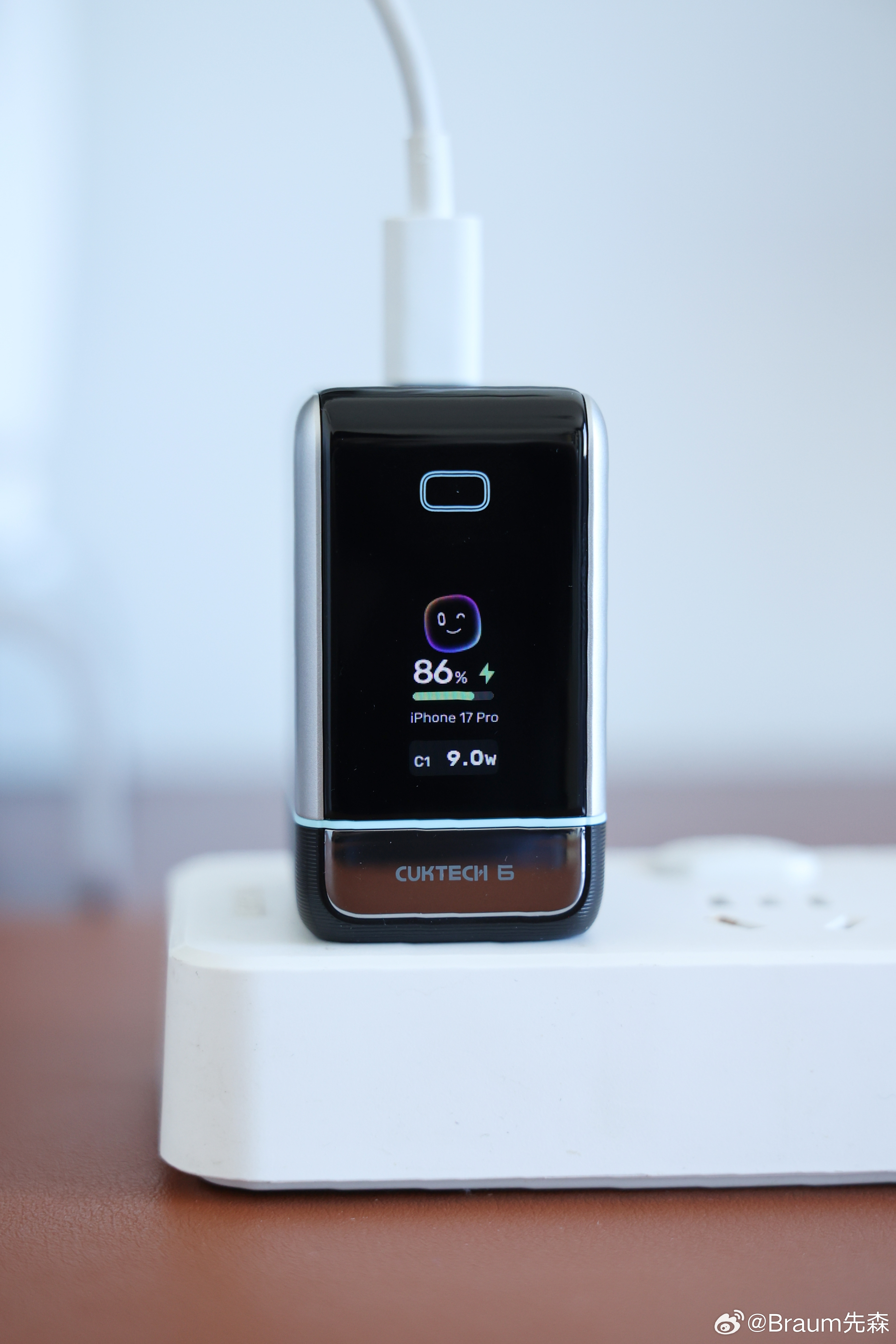 酷态科新玩具,带屏幕的6号屏显充Ultra。不知道从哪来的启发,做了个充电时的吉祥物,根据充电状态不同有三种表情,仅能在安心充模式下开启。