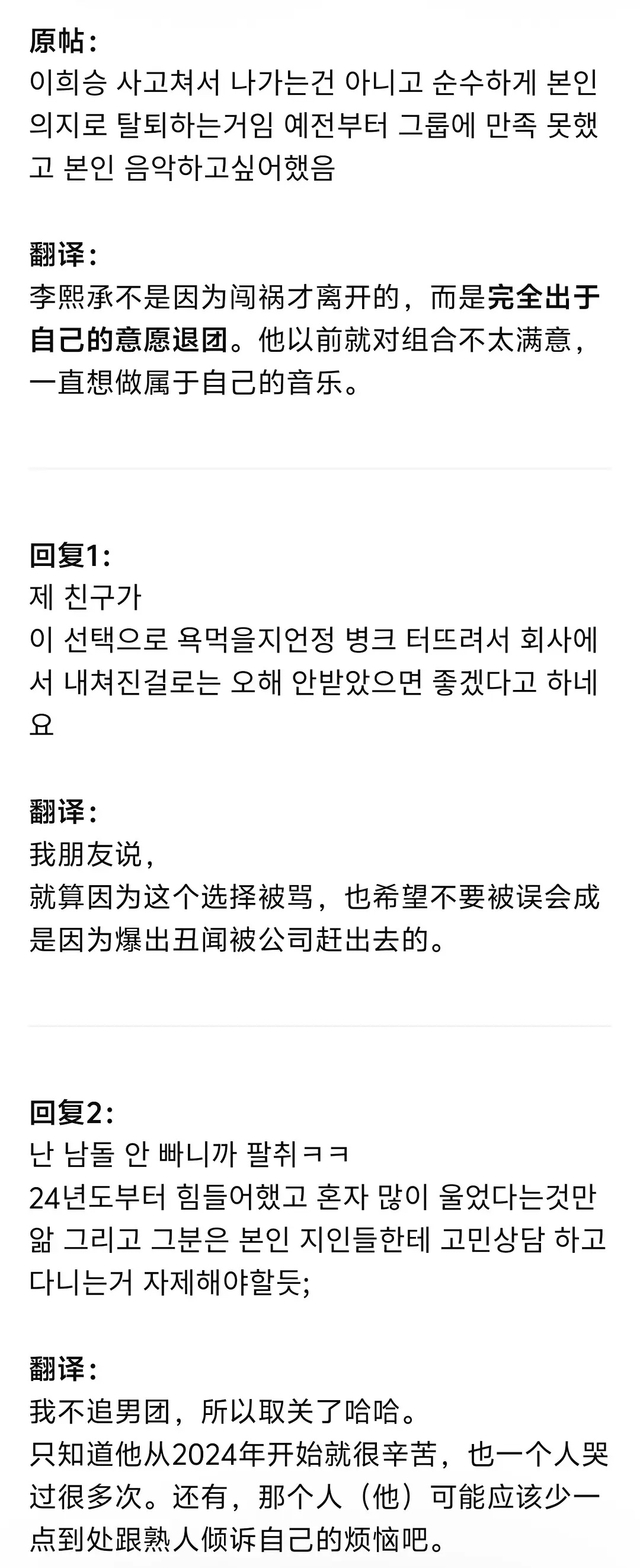 李羲承退出组合原因 推上说的退队原因李羲承出于自己的意愿退团,以前就对组合不太满意,一直想做自己的音乐🎵不是因为闯祸才离开的。韩娱事变 Kpop大地震