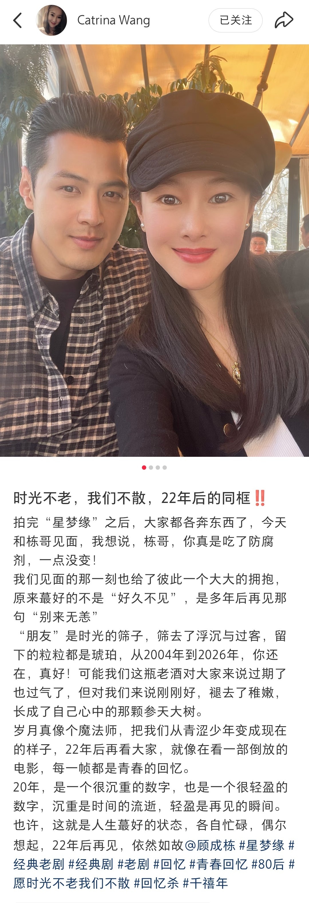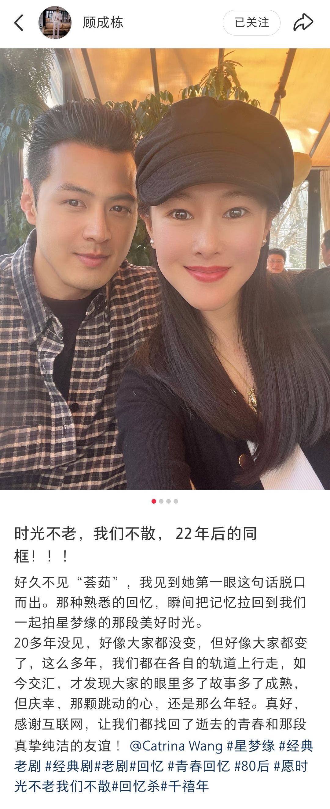 【星梦缘主演20年后再同框】老天爷~看到这张合照,真·时代的眼泪!最近,《星梦缘》两位主演顾成栋、王杨分享了合影~梦回“劳文希”和“杨荟如”!顾成栋说,20多年没见,大家都在各自的轨道上行走,庆幸那颗跳动的心还是那么年轻~王杨也说,当年拍完《星梦缘》之后大家都各奔东西了,但再见还会想说,真是吃了防腐剂!“可能我们这瓶老酒对大家来说过期了也过气了,但对我们来说刚刚好,褪去了稚嫩,长成了自己心中的那颗参天大树。”谁懂啊,当年真的爱看《红苹果乐园》和《星梦缘》,你看过吗?