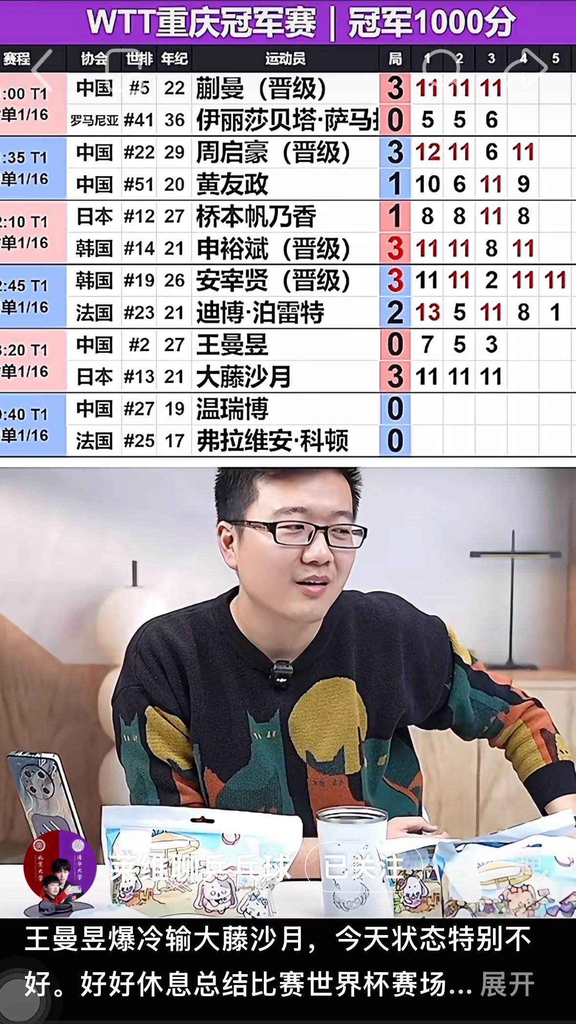 莱维谈王曼昱爆冷输大藤沙月:“今天状态特别不好, 正手位出台球都拉丢了, 失误也很多, 大藤明显改变了技战术, 衔接速度也是有明显提升, 有人说该研究外协了, 但不用研究大藤沙月, 因为大藤参加不了世乒赛, 日乒伦敦世乒赛的名单是 张本美和,早田希娜,长崎美柚, 面手凛和桥本帆乃香, 没有大藤沙月! 就是曼昱纯粹状态差, 不过竞技体育有输有赢, 曼昱今天临场应变能力不够, 大藤超水平发挥,又在发球 和接发球都有所改变, 尊敬每一位为国争光的运动员, 希望曼昱好好总结经验, 接下来的世界杯和世乒赛 都是非常重要的比赛, 世界杯见!” 莱维说的挺好, 竞技体育有输有赢,想赢不怕输, 每一个运动员站在赛场上都想赢, 曼昱连续征战, 休息一下,调整状态,总结经验, 后面的比赛世界杯和世乒赛 都是不容有失的比赛, 加油曼昱!
