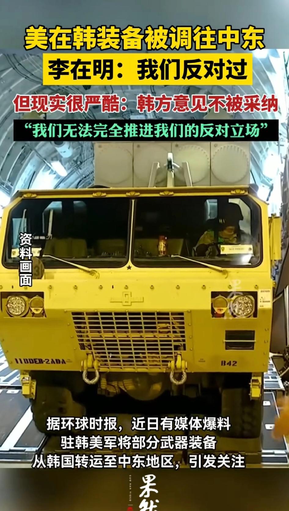 美在韩装备被调往中东!李在明:我们反对过,但现实很残酷:韩方意见不被采纳,我们无法完全推进我们的反对立场。 驻韩美军部分“萨德”反导系统被调往中东,这事儿可太有看头了。2017年“萨德”入韩,说是保护韩国防朝鲜导弹,实则窥探周边国家,搞得中韩关系一度紧张,当地民众也激烈反对。 驻韩美军的“萨德”系统包括先进探测雷达等,扫描范围达2000公里。 如今美国在中东防空吃紧,立马把韩国“萨德”盯上并运走。 韩国总统李在明虽表态这对半岛局势影响不大,可也无奈承认韩方反对意见不被采纳是“严酷现实”。 李在明的意思是,我们不同意他们把装备运到中东,但是我们说的不算,所以我的态度摆出来了,就是武器虽然在我们国家,但我们说的不算。 这也说明在美韩关系里,韩国很多时候只能被动接受,所谓盟友,不过是美国的棋子罢了。