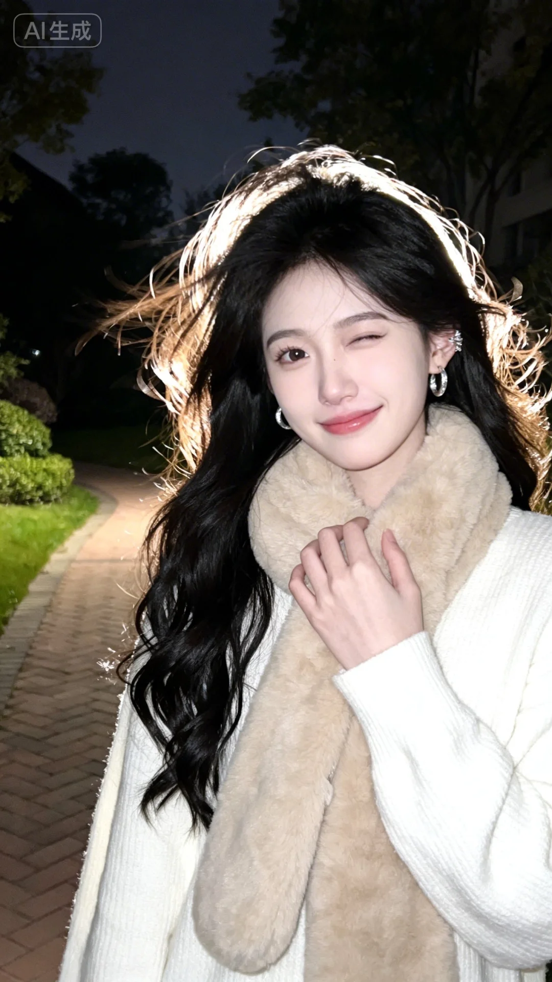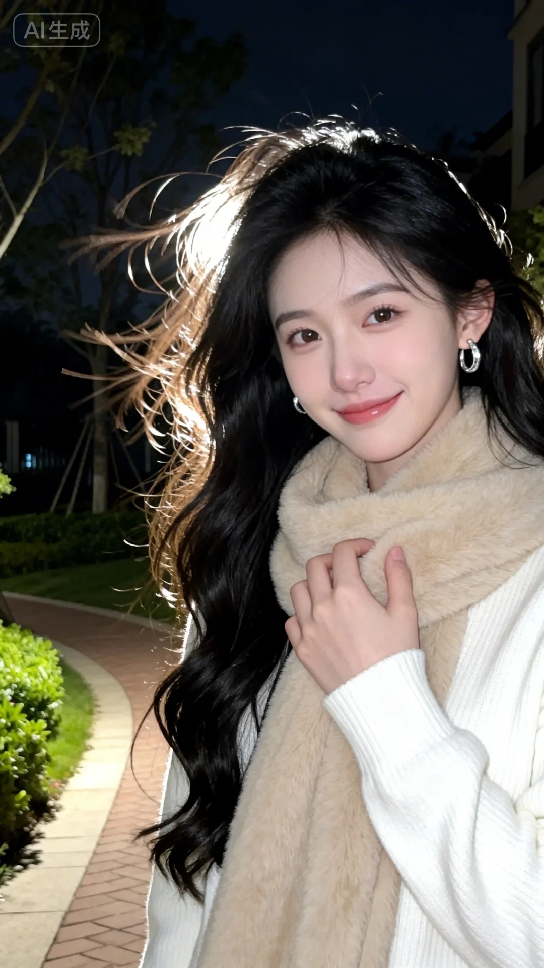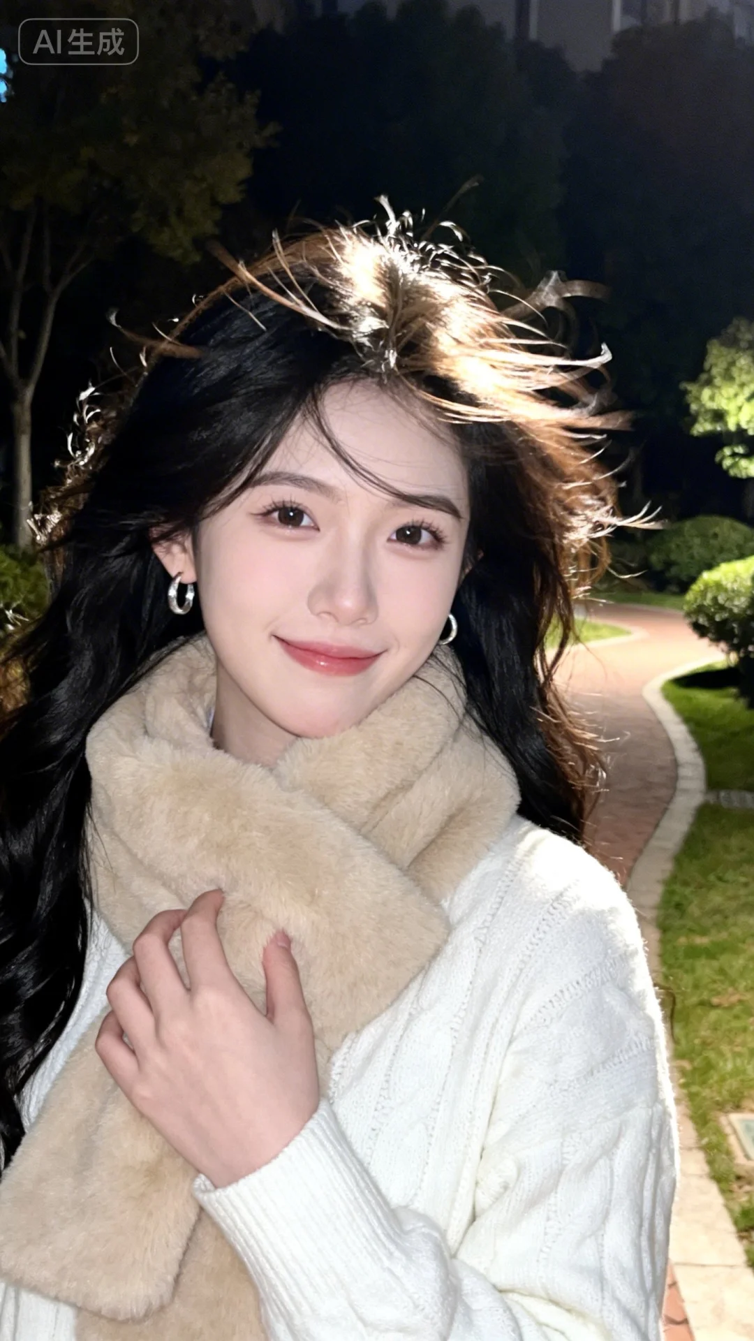 漂亮女生,23岁网红女,冷白皮。黑色长卷发(被风吹动,略显凌乱),发丝发光韩系白开水妆容,白色毛衣,米色毛绒围巾,银色耳饰,手放围巾上姿势,夜晚户外小区场景(背景、小路,绿化、树木、昏暗的环境)给皮肤镀上一层清透的质感,带着“夜间随拍”的网感,既日常又有氛围感,手机拍摄风格,古早滤镜,做可爱表情