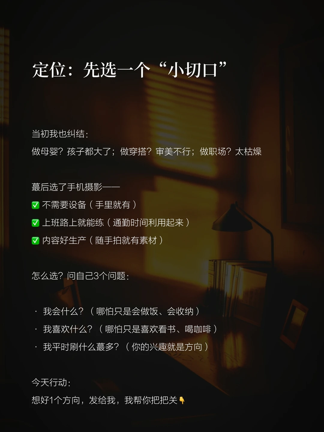 ❶ 定位:别想太多,先选一个“小切口”