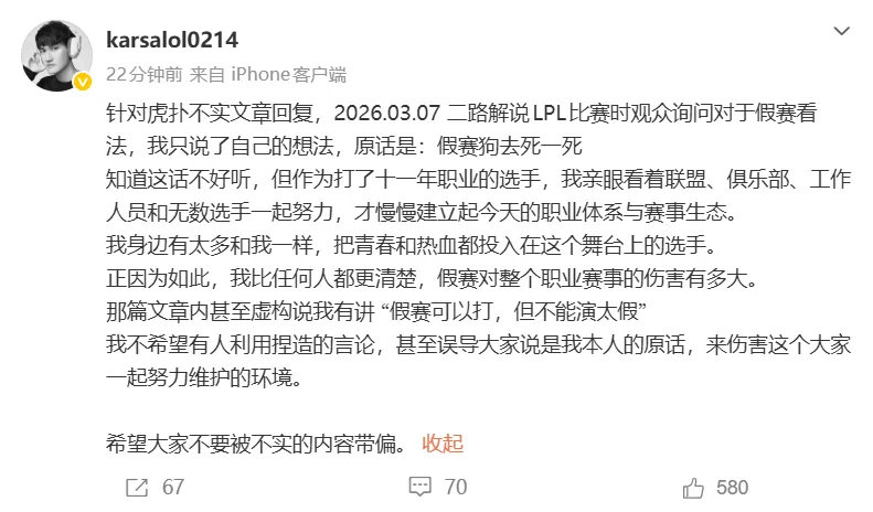 Karsa:我比任何人都更清楚,假赛对整个职业赛事的伤害有多大。我不希望有人利用捏造的言论,甚至误导大家说是我本人的原话,来伤害这个大家一起努力维护的环境。希望大家不要被不实的内容带偏。