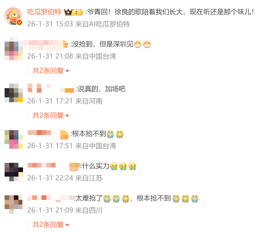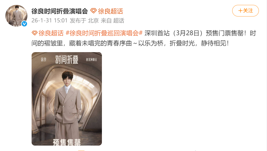 徐良三场演唱会我都坐不进去徐良首次开演唱会还加场三场全部售罄了,跟你们这些手速快的人拼了,三场演唱会我都坐不进去!出道这么多年依然这么火热,粉丝黏性高且长情这一块还是太权威了,坐等现场见面大合唱啦