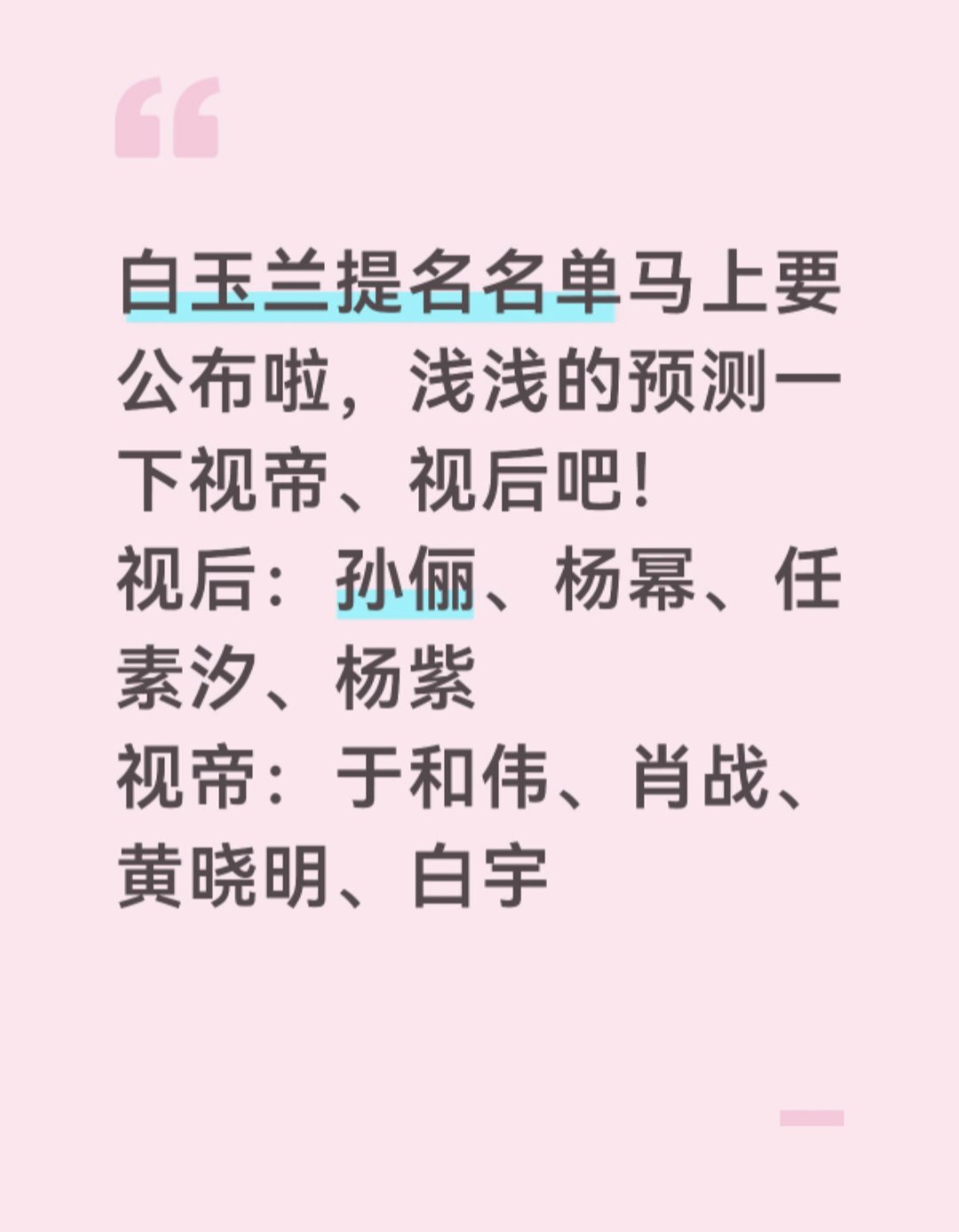2026白玉兰预测白玉兰提名名单马上要公布啦,浅浅的预测一下视帝、视后吧视后:孙俪、杨幂、任素汐、杨紫视帝:于和伟、肖战、黄晓明、白宇
