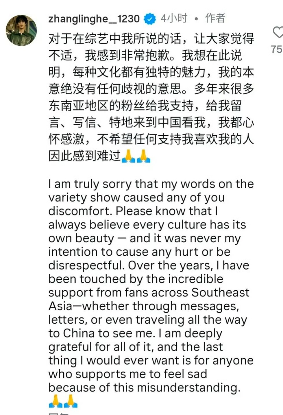 张凌赫赛车服张凌赫在综艺上疑似因为说错话,被东南亚等地区海外网友批评了……他前几天给粉丝回复的内容也被网友说了……还有3.8女神节也被说了,感觉很多都是他自己说的不恰当导致的,他应该审视一下自己……本就不好的路人缘雪上加霜…。 张凌赫回应回复粉丝