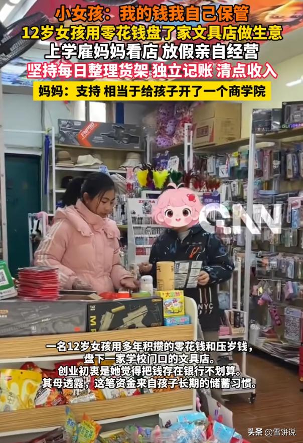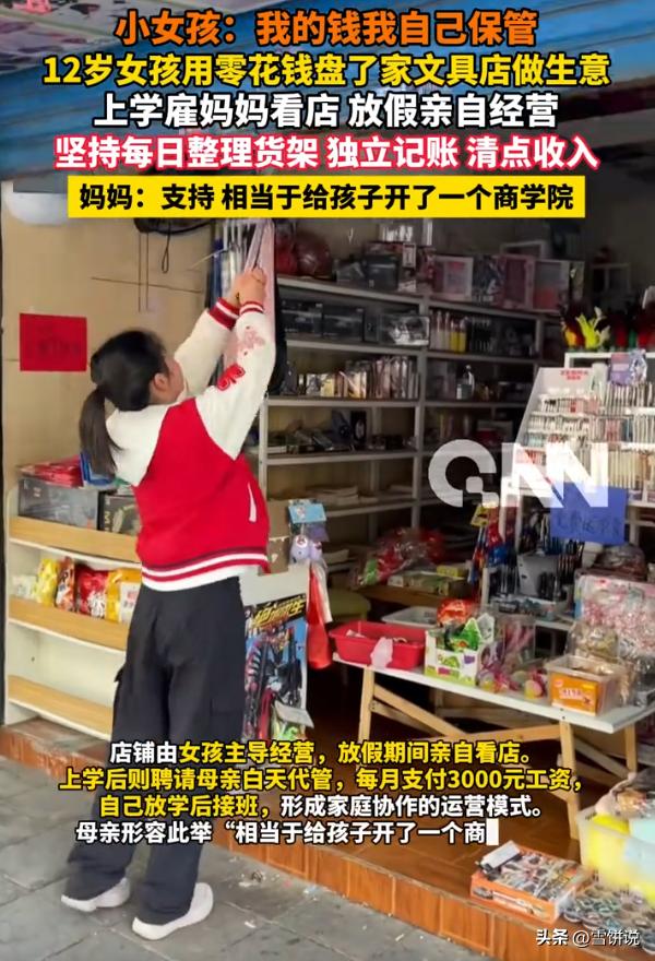 江西,一名12岁女孩收了几万块的压岁钱,再加上平时攒下来的零花钱一共有40000元,她觉得存到银行不划算,竟然直接盘下学校门口的一家文具店,自己当起了老板,让妈妈给她打工。好在妈妈支持,结局是好的 一般孩子手里有这么多钱,要么存银行,要么买点自己喜欢的东西,再不然就是交给爸妈保管。但这姑娘不一般,她觉得存银行利息太低,钱放着也是放着,得干点啥 正好赶上学校门口有家文具店要转让,小姑娘自己去看了几趟,琢磨来琢磨去,一咬牙,把这四万块全拿出来,直接把店给盘下来了 店有了,谁来管?她找上她妈,开门见山:你现在有空,帮我上个班呗。她妈当时就愣住了,心想这孩子唱哪出。小姑娘这才说,自己把压岁钱拿去盘了个店,就在学校附近,平时她上学,妈妈帮忙看店,她按月发工资,一个月三千 这下就有意思了。平时孩子上课,妈妈在店里盯着。等放了学或者周末,小姑娘自己一头扎进店里,招呼同学、整理货架、算账记账,干得有模有样。进货卖什么、怎么摆好看、价格怎么定,她都自己琢磨,妈妈就是个帮忙的 妈妈看到女儿如此投入,也没有泼冷水,表示支持这样的行为,就当是给女儿开了个商学院 这事传到网上,不少人感慨,这哪是12岁,这脑子转得比很多大人都快。四万块存银行,一年利息没多少,盘个店,挣的是流水,练的是生意经,再不济最后还有一堆货在手里,确实比存着划算 其实这孩子最让人佩服的不是有钱,是她真敢想也敢干。看到机会就抓住,还知道怎么用人,把妈妈发展成员工。而且她自己也真上心,不是甩手掌柜,放假了天天泡在店里,亲力亲为。这种劲儿,比那四万块本金金贵多了