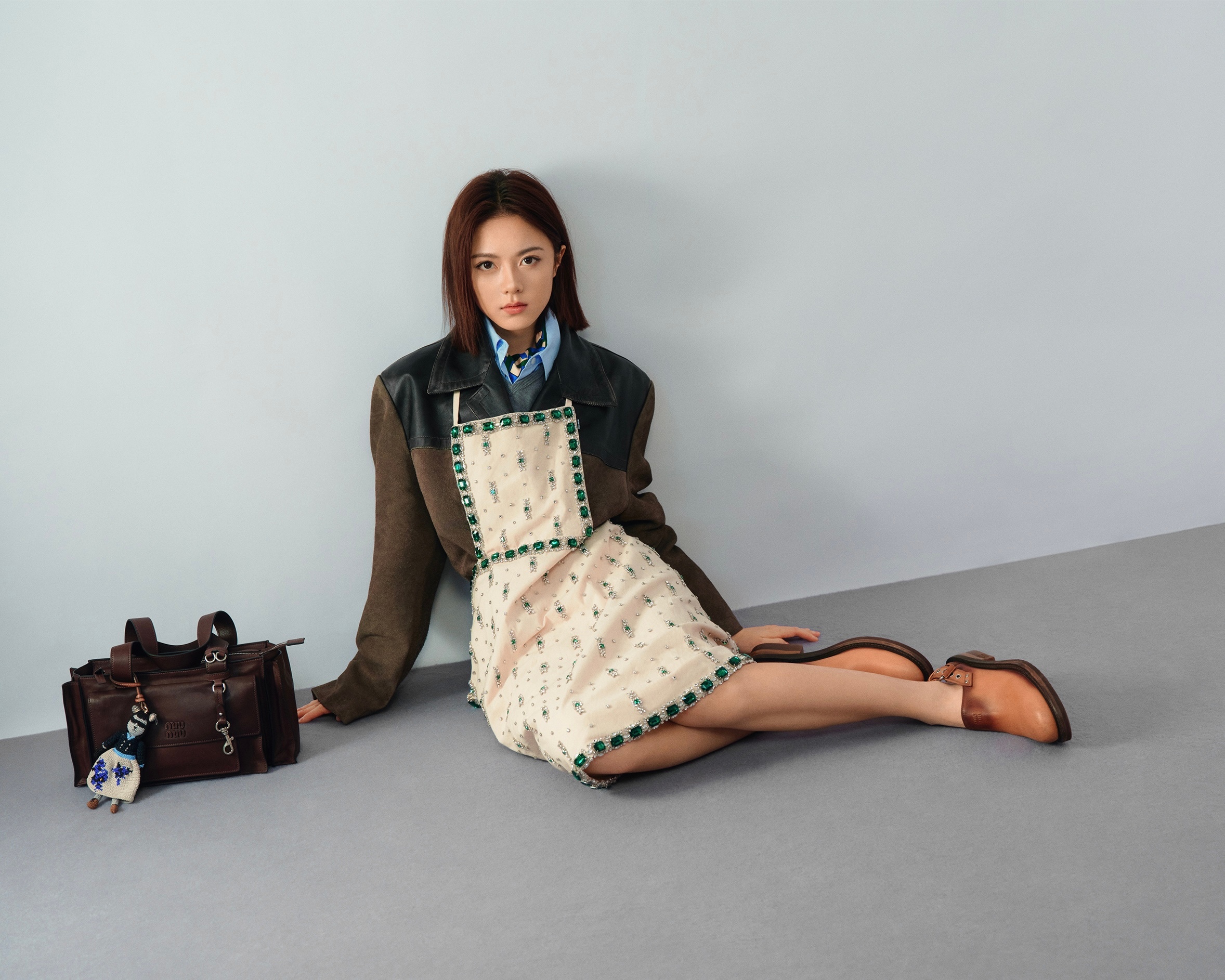 虽未能到场观秀 ,线上的宣传肯定不能少 ,来自品牌大使赵今麦出镜的一组今晚 Miu Miu 大秀预热大片 ,演绎 2026 春夏系列闭场 Look ,复古皮质外套与钻饰围裙式裙装拼接打造 ,甜美与酷飒兼具的 Miu 女郎 ~ 📸