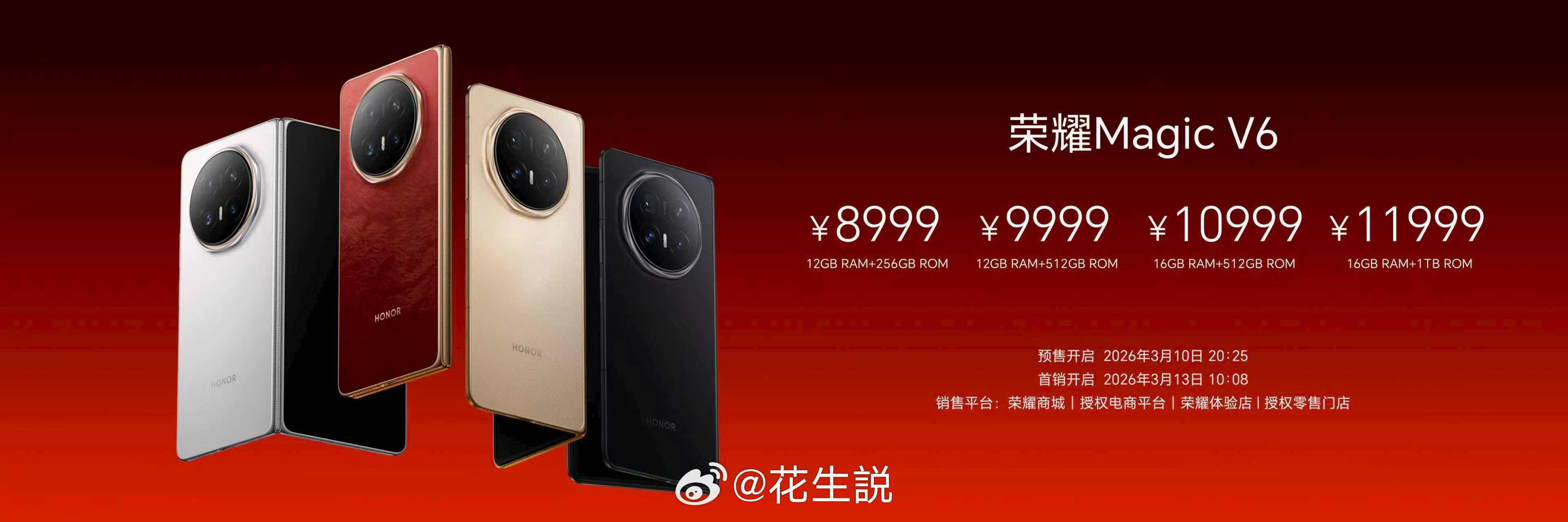 荣耀Magic V6 共提供12GB+256GB、12GB+512GB、16GB+512GB、16GB+1TB四个版本,售价8999元起。