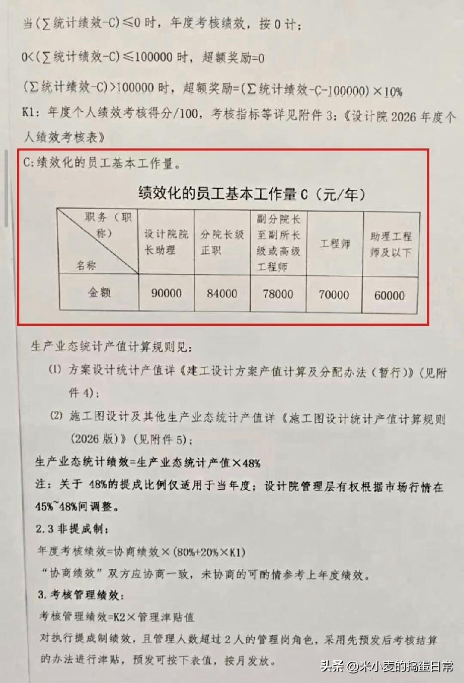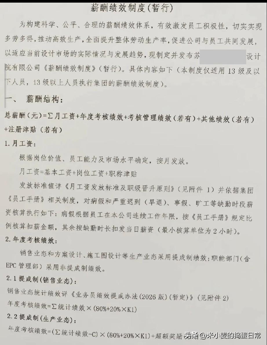 设计院薪酬制度曝光,这保密要求也太狠了吧! 刚看到一份设计院的薪酬绩效制度,看完直接倒吸一口凉气! 先不说那复杂的提成公式,光是员工薪酬绝对保密这一条,就够扎心的——敢打听、讨论薪资,直接解除劳动合同!这保密力度,比很多大厂都狠。 再看绩效算法,工程师的基本工作量C就定在7万/年,统计绩效扣完C才开始算考核绩效,低于0直接按0计,还可能被调岗。超额奖励更是苛刻,超过10万的部分才给10%,等于干到死也拿不到多少增量。 最讽刺的是,连未中标项目的商务配合,都只给合同额1.5‰的提成,这点钱连喝杯奶茶都不够。 设计院天天喊着要多劳多得,结果制度把员工卡得死死的,难怪现在设计岗都成了“劝退专业”。 你觉得这种薪酬制度,能留住真正干活的人吗?