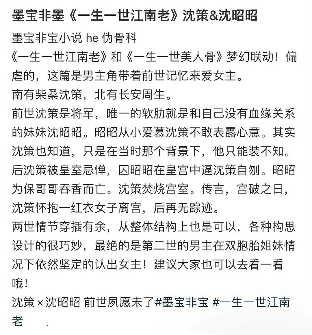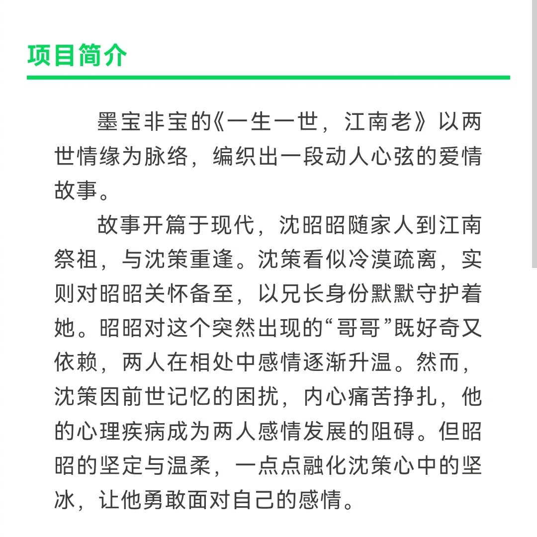 《一生一世江南老》要影视化了!墨宝非宝亲妈编剧,华策出品。还是熟悉的配方,伪骨科+古代现代双线叙事,跟《周生如故》《一生一世》一个路子。目前选角还没一点风声……淑芬心里有合适的人选吗?