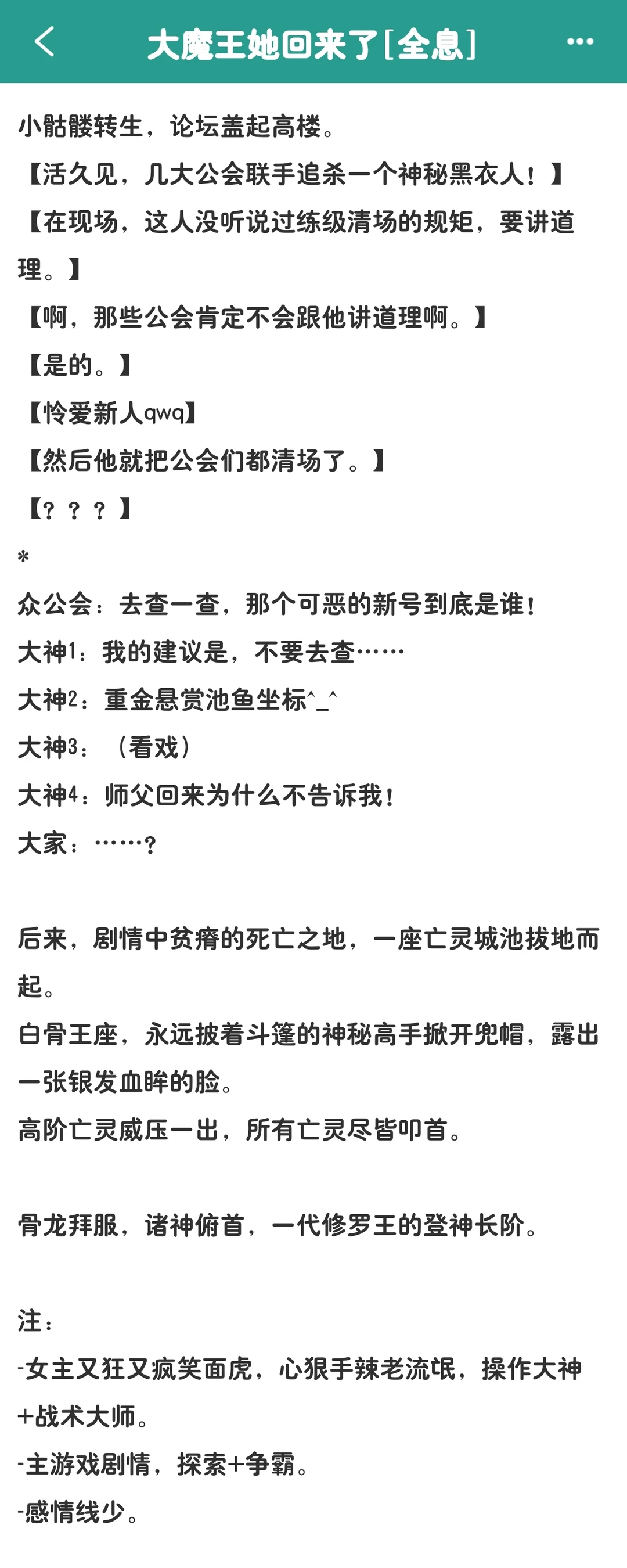 是一篇很纯正的全息游戏文,只谈游戏不谈其它,玩家之间的对抗、游戏阵营的对抗、女主坑其他人的日常都很有意思,强烈推荐。