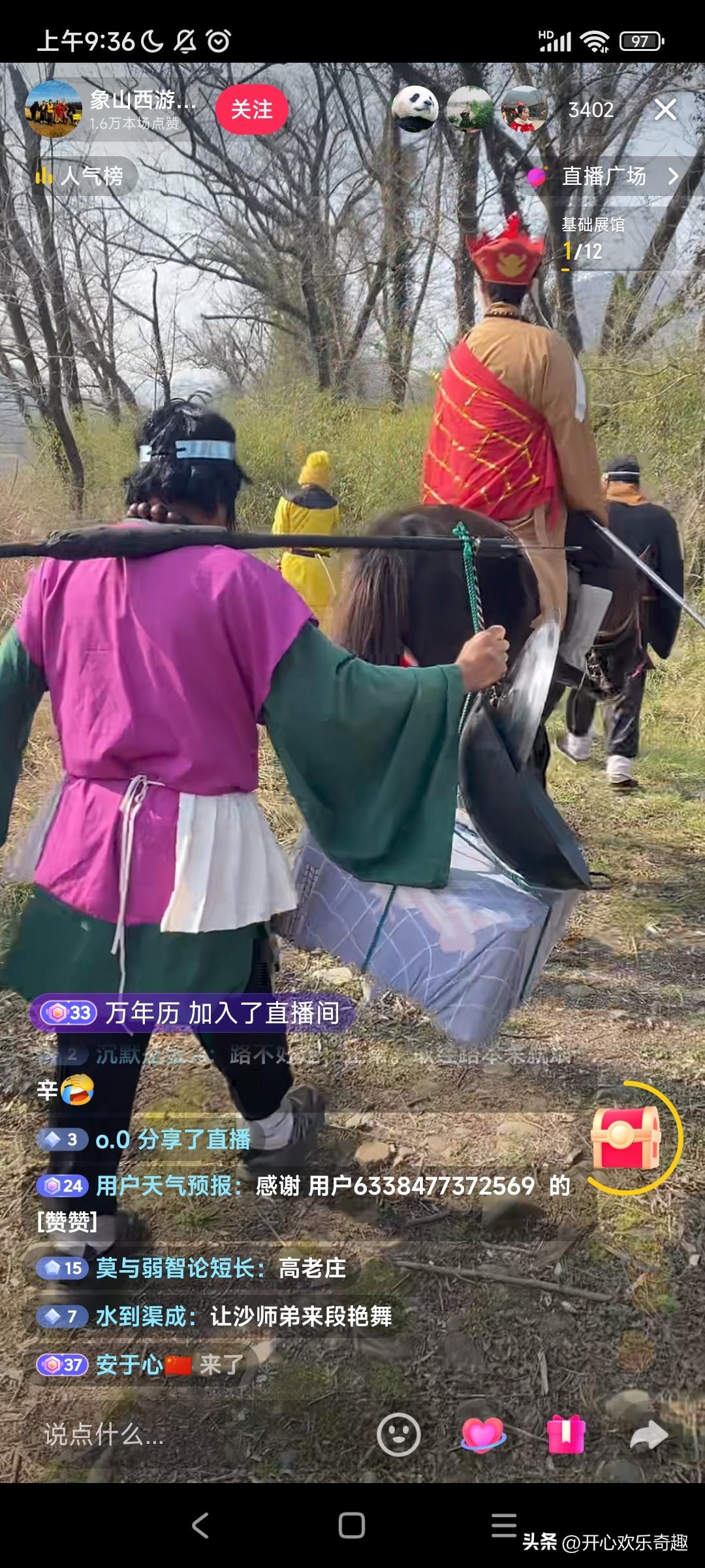 86年的西游记,画面又重新到我们的眼前了。 而且这妥妥是现实版。 唐僧,孙悟空,猪八戒,三中,而且他们还找来了龙马,只可惜这不是白龙马,而是乌龙马。 如果他们可以转来白龙马就100分了。 几个当中最累的就是沙憎了,你看他担着多少的行李,最轻松就是唐僧了,每天不是走路就是看着他那本书,拿着他那个手机。西游记奇观 农村人拍西游记 而且每天看他们直播的人都蛮多的。