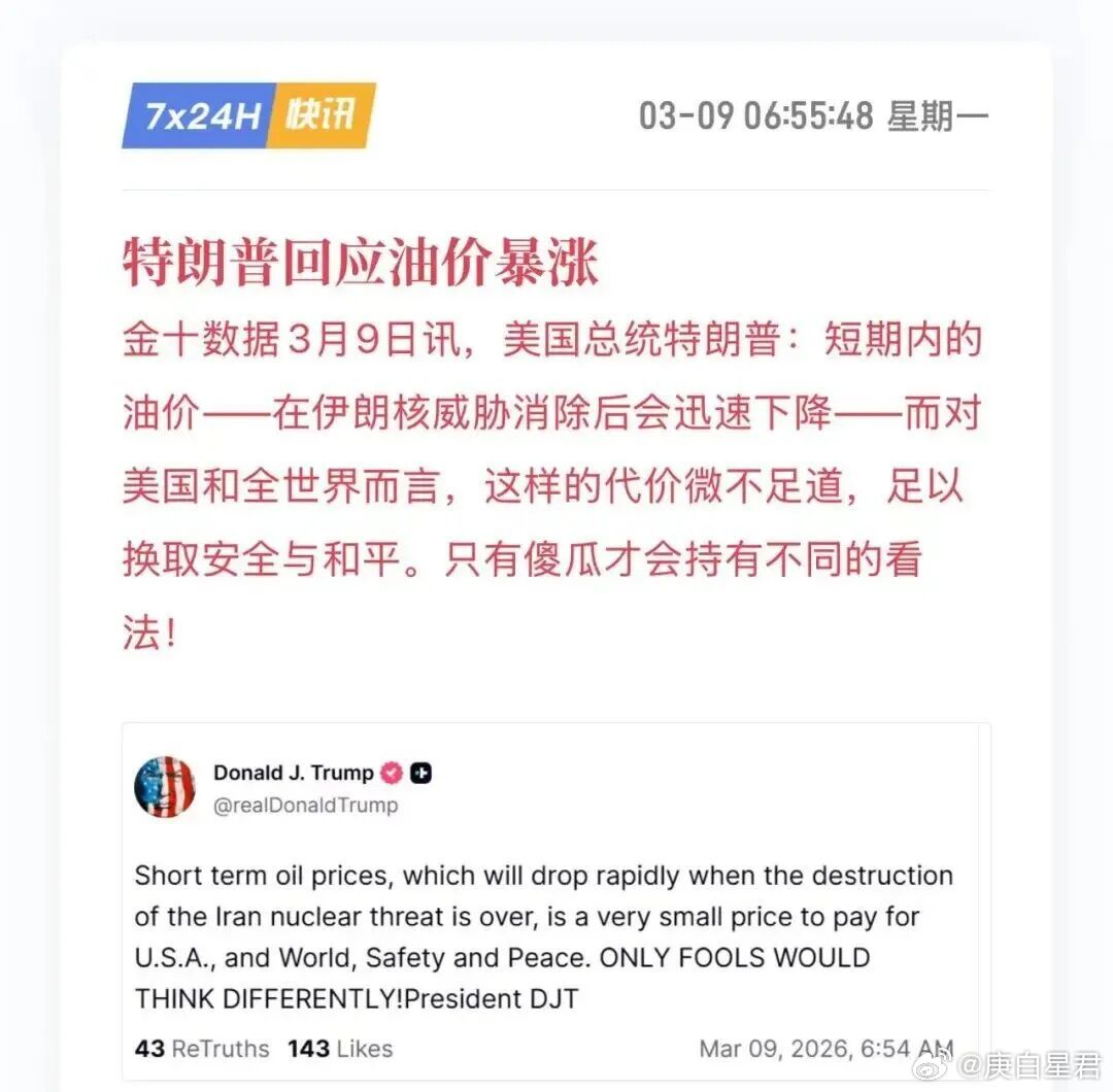 特朗普的命门现在是彻底暴露在伊朗人面前了,就看伊朗这一次能不能抓住了。这个命门就是油价,你会发现只要油价一涨,特朗普立刻就慌了。3月9日刚开盘,国际油价就涨了10%。