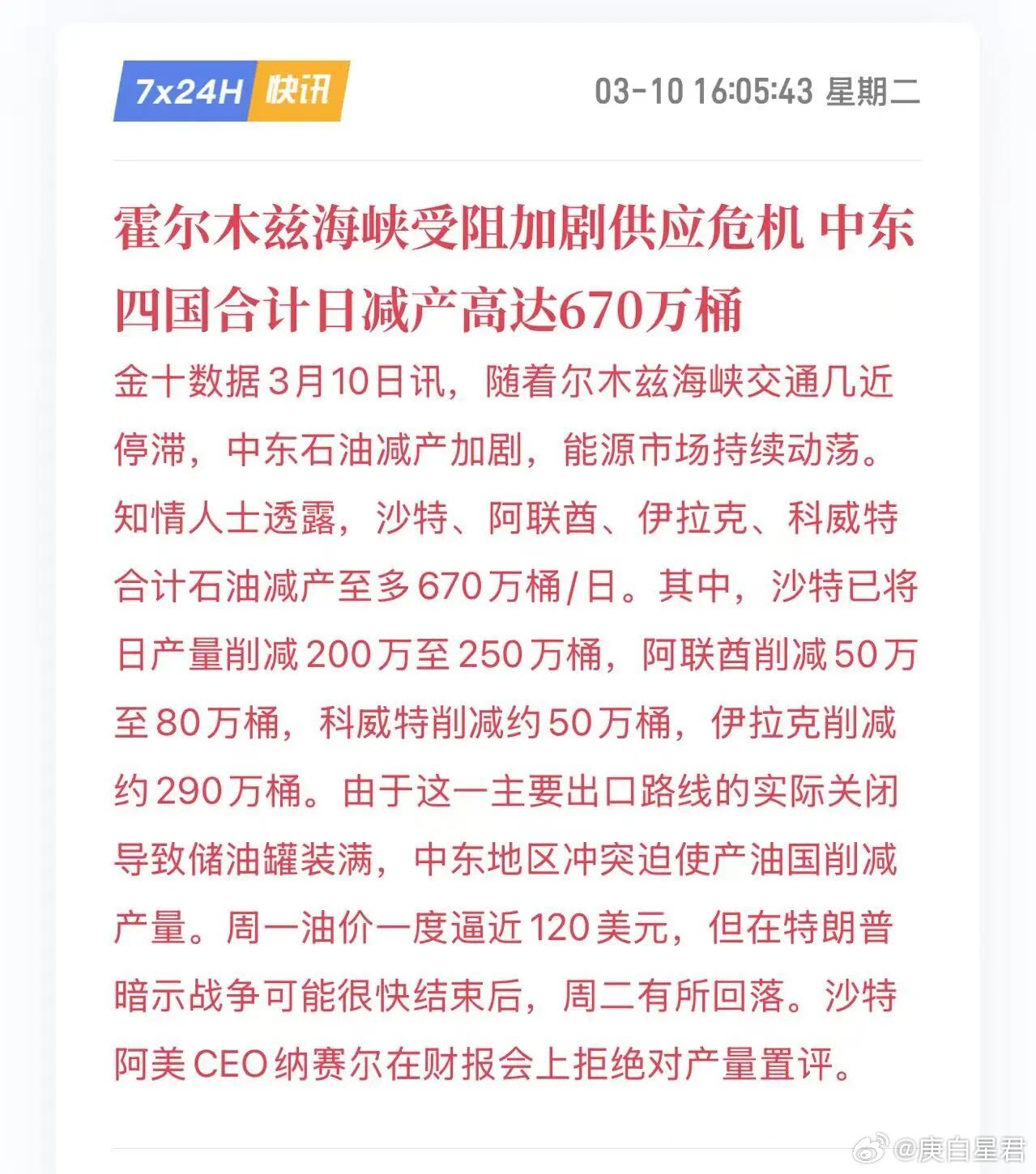 可是另一边,中东四大产油国却集体削减产量,每天要减产670万桶石油。现在特朗普的命门已经暴露出来,就看伊朗能不能抓得住。美国距离彻底衰败,只差一场局部战争了,会不会就是这场伊朗战争呢?伊朗只要能再坚持上几个月就会发生两件事: