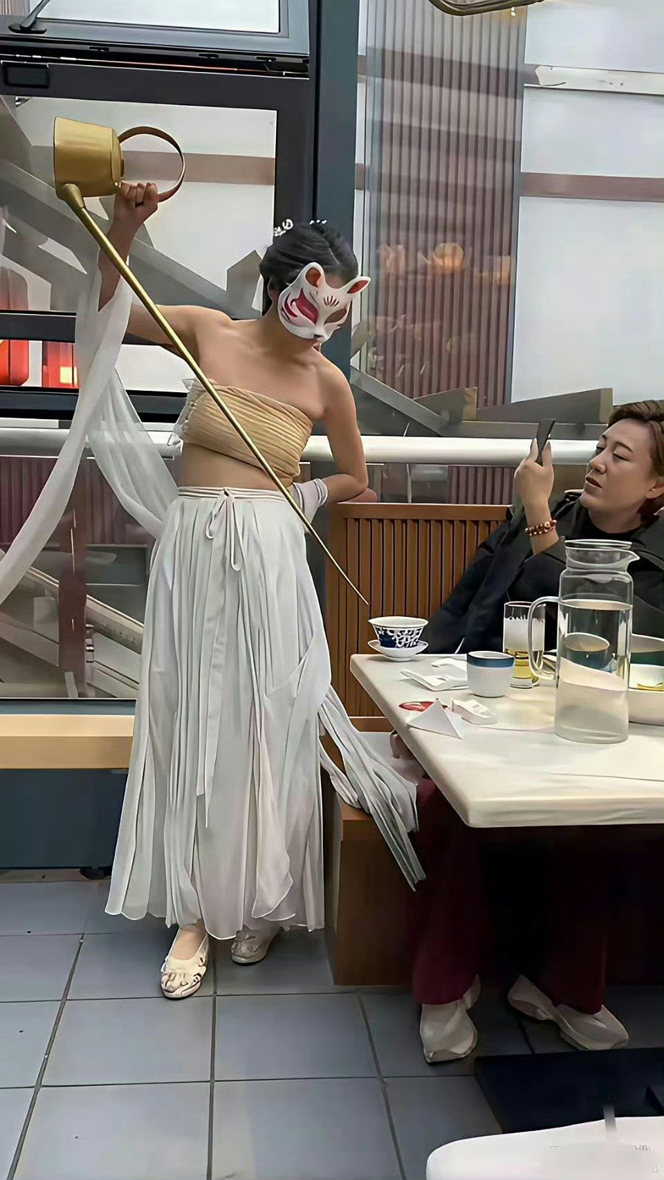 46岁秦岚在宁波一家餐馆吃饭,和老板一起拍摄合影。她看起来好年轻,身材太好了!