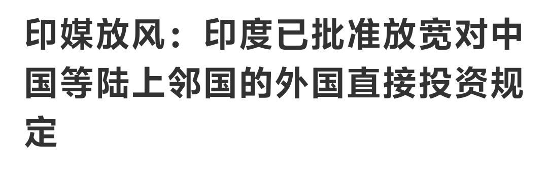 印度报业托拉斯与美国彭博社等媒体援引消息人士的话报道称,印度政府当地时间10日批准放宽了对包括中国在内与印度陆上接壤国家的外国直接投资的规定。 我说几句:能够意识到改变就是进步的开始!但对印度来说,仅仅放宽投资还远远不够。一句话,如果外资企业在印投资回报得不到保障,哪怕不设门槛也没有多少企业愿意冒险。所以,着眼点既在放宽投资门槛,也在打造好的营商环境!