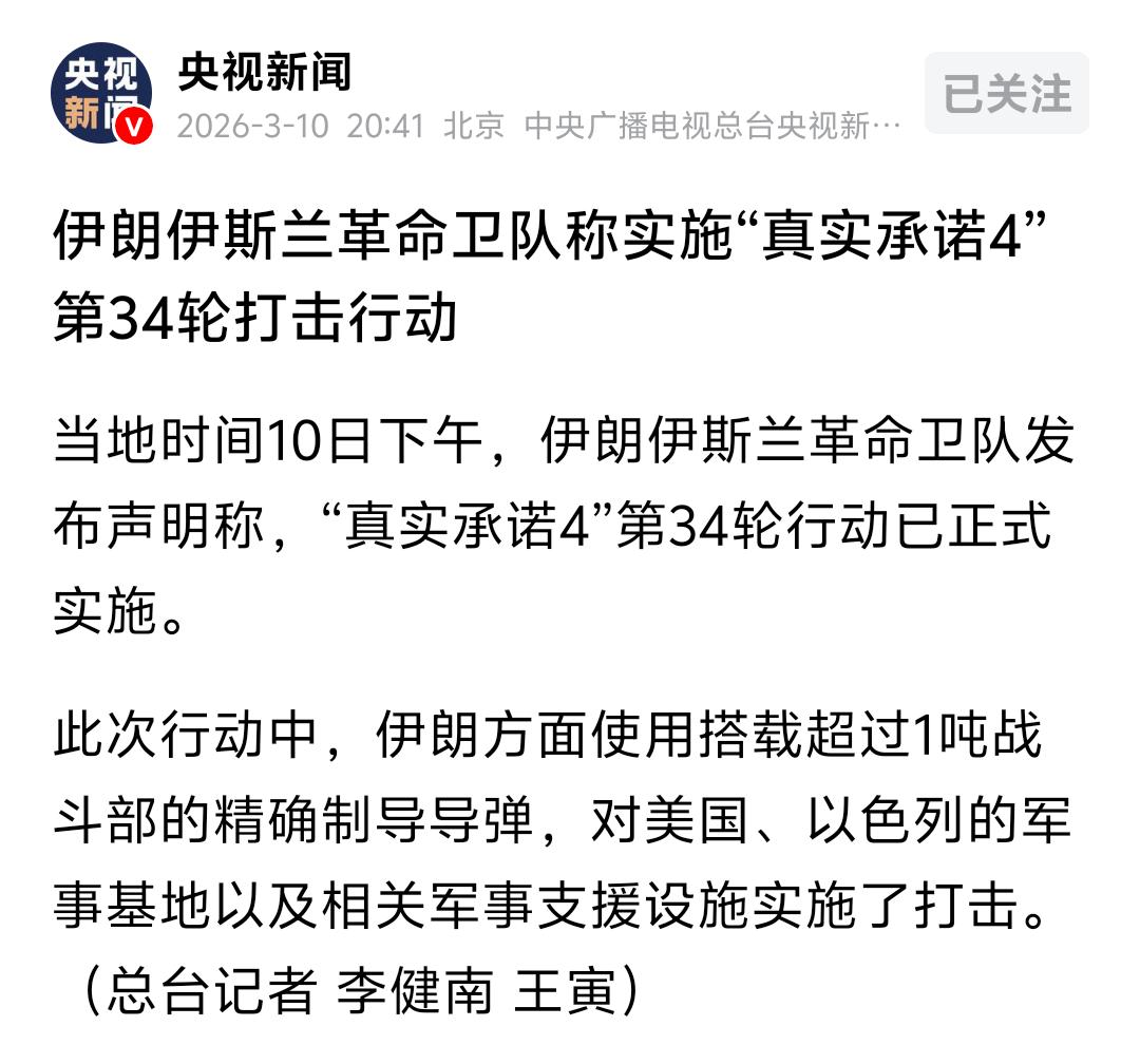 央视新闻消息,当地时间3月10日下午,伊朗伊斯兰革命卫队发布声明称,“真实承诺4”第34轮行动已正式实施。 我说几句:从2月28日到3月10日,11天时间“真实承诺-4”共进行了34轮反击,日均反击次数超过了3次,也就是无论是反击轮次还是日均反击次数来说,都远超2025年“真实承诺-3”。种种迹象表明,伊朗的反击决心巨大,美国和以色列这次啃上了一根“硬骨头”。