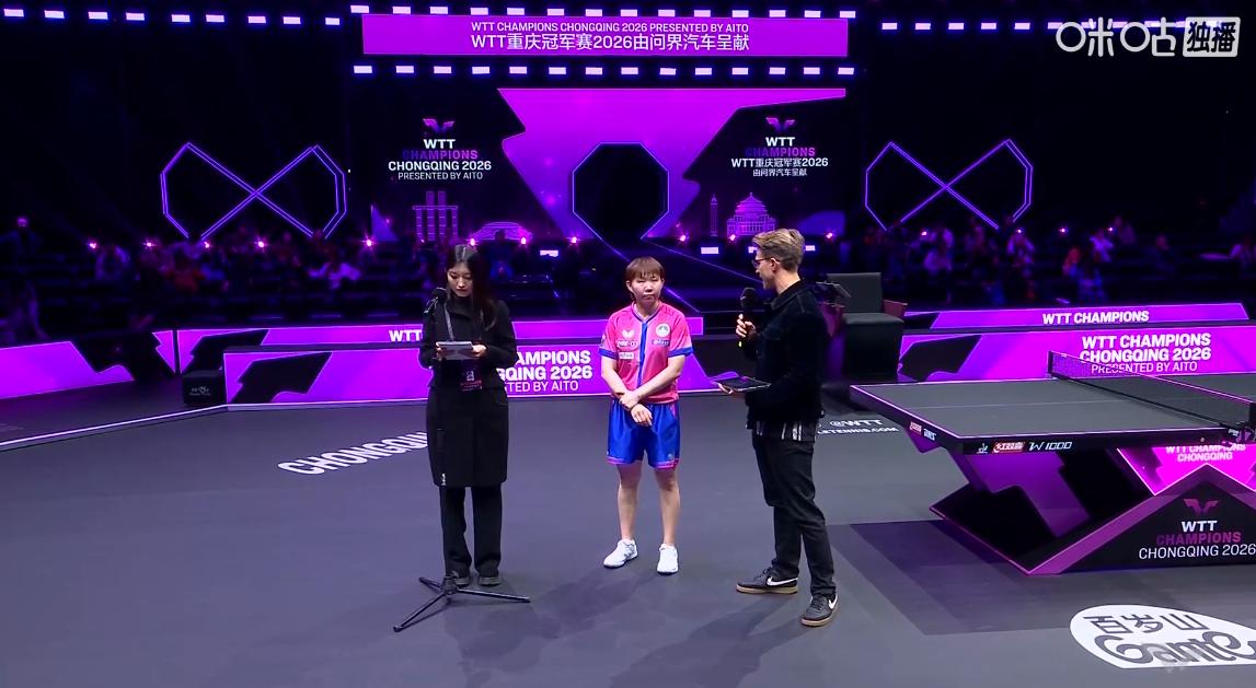 主持人又给朱雨玲挖坑了,看世界冠军如何巧妙化解, 朱雨玲被问到:这是今年的第三次对阵韩莹, 能够保持着全胜战绩, 觉得自己在应对削球打法上有哪些变化和提升? 朱雨玲回答:跟韩莹非常的有缘分, 连续三站比赛相遇, 在比赛中感觉到每一分都赢得艰难, 其实彼此都很熟悉, 希望在乒乓球的舞台上共同进步, 当朱雨玲被问到接下来的比赛时, 朱雨玲直言:这是自己连续5场打到特殊打法, 所以希望自己在跟同类打法时能够跟上节奏, 希望自己能展现出一个最好的精神面貌