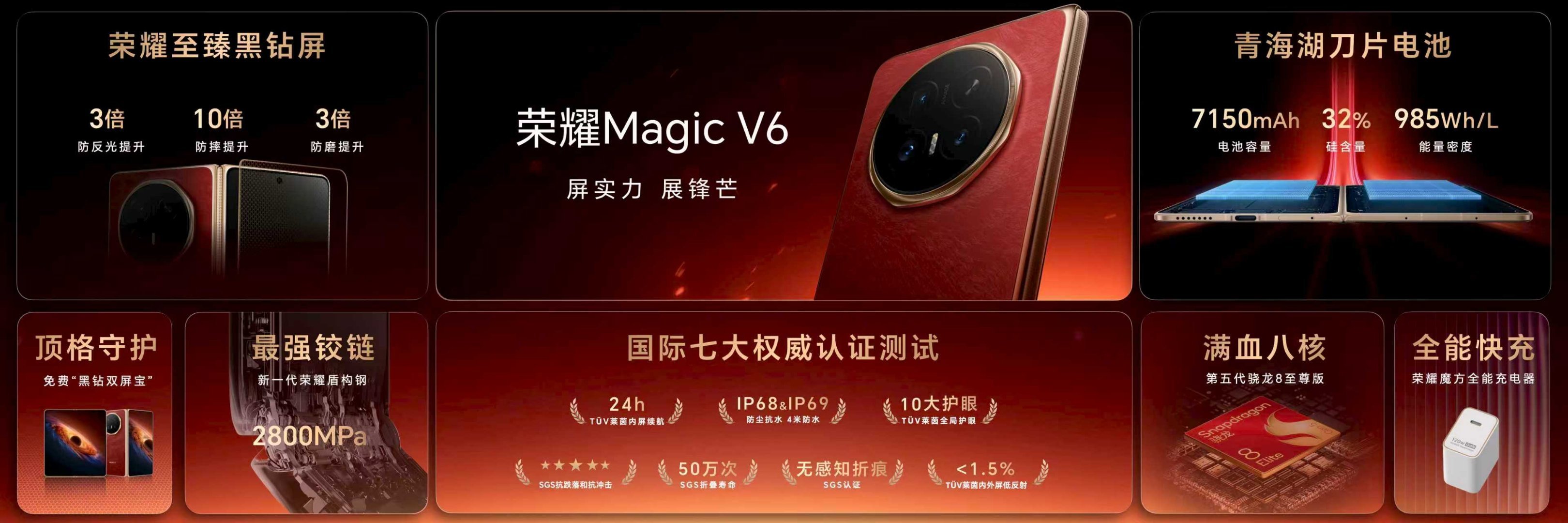 荣耀Magic V6 全系标配新一代魔方充电头,在新一代GaN充电技术加持下,以同类产品中的超小体积,最高可实现120W的超能输出,并可兼容全品牌、全设备的全部主流快充协议。 荣耀Magic V6拥有最可靠荣耀黑钻屏,通过国际7大权威认证测试,并拥有最高硅含量折叠屏电池,兼顾可靠、续航、护眼、防水,屏全能硬实力,展旗舰真锋芒!