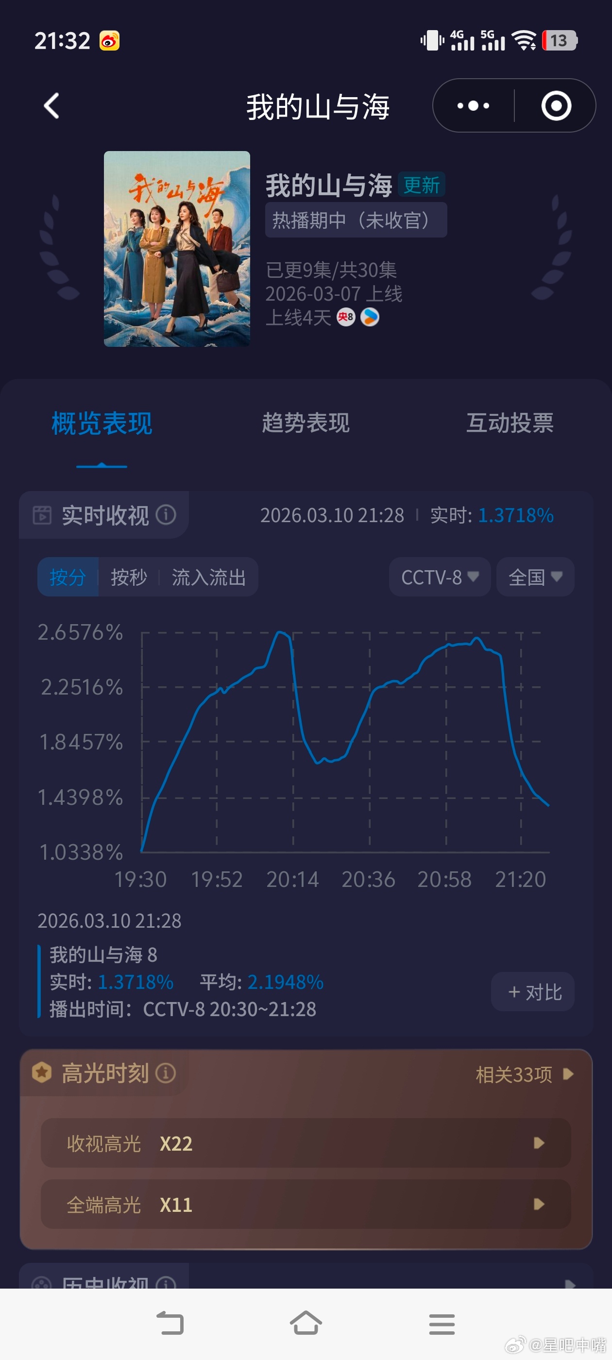 未婚夫去世了该不该赡养对方父母《我的山与海》今晚收视小降!峰值和平均都降了!来看双集酷云走势第一集:起点1.0338,峰值2.6606,平均1.9996第二集:起点1.7904,峰值2.61--,平均2.1948双集平均:2.0964CVB估值:2.0964×0.935=1.960