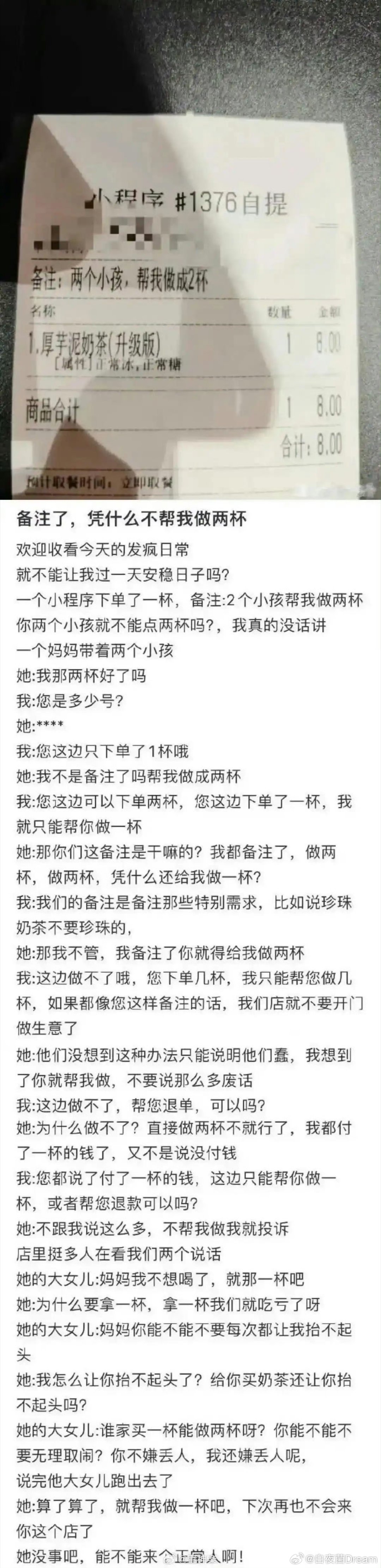 我还以为是下单一杯,备注做成两杯
