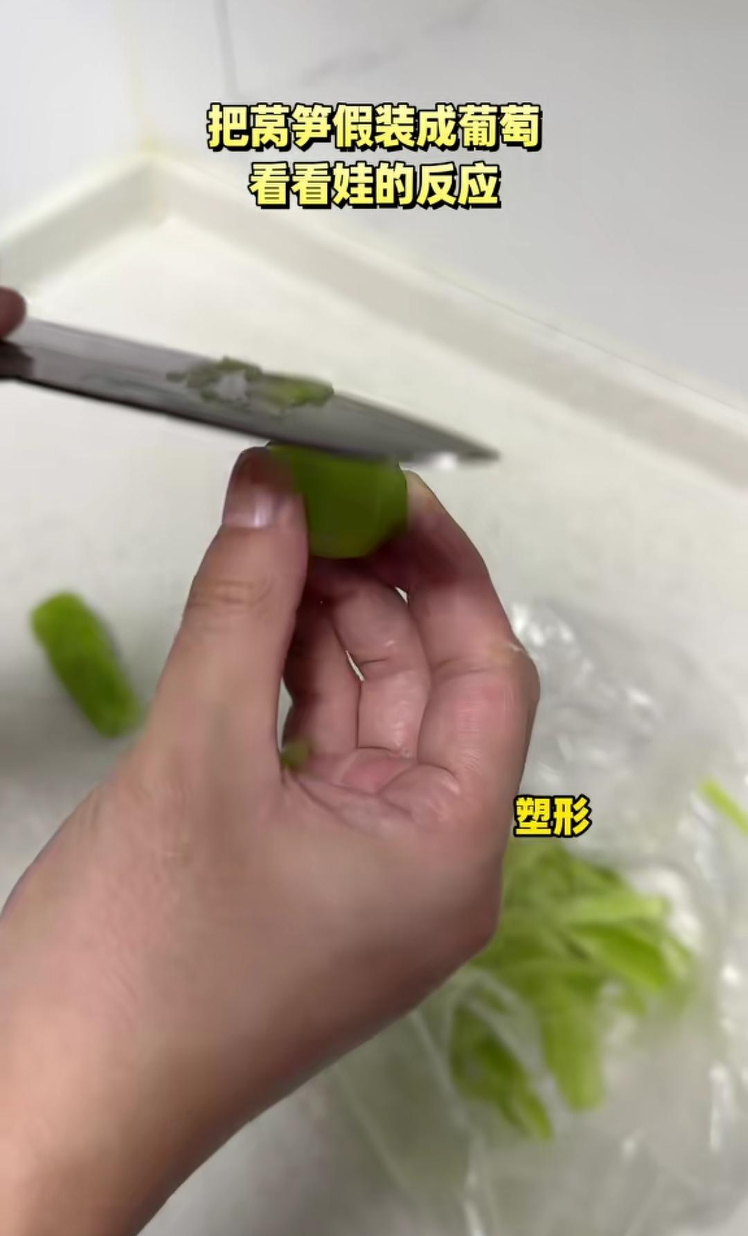 小孩子不爱吃蔬菜,父母操碎了心。 (如图所示)好像人小时候都不爱吃蔬菜,可能是觉得蔬菜的味道和口感不好,但不吃蔬菜绝对不行,于是乎家长们操碎了心,八仙过海各显其能。这个父母有绝招,刀功好、特别有耐心,竟然把嫩莴笋削成了葡萄状,索性小孩子很爱吃,也算没有辜负父母的一片苦心。
