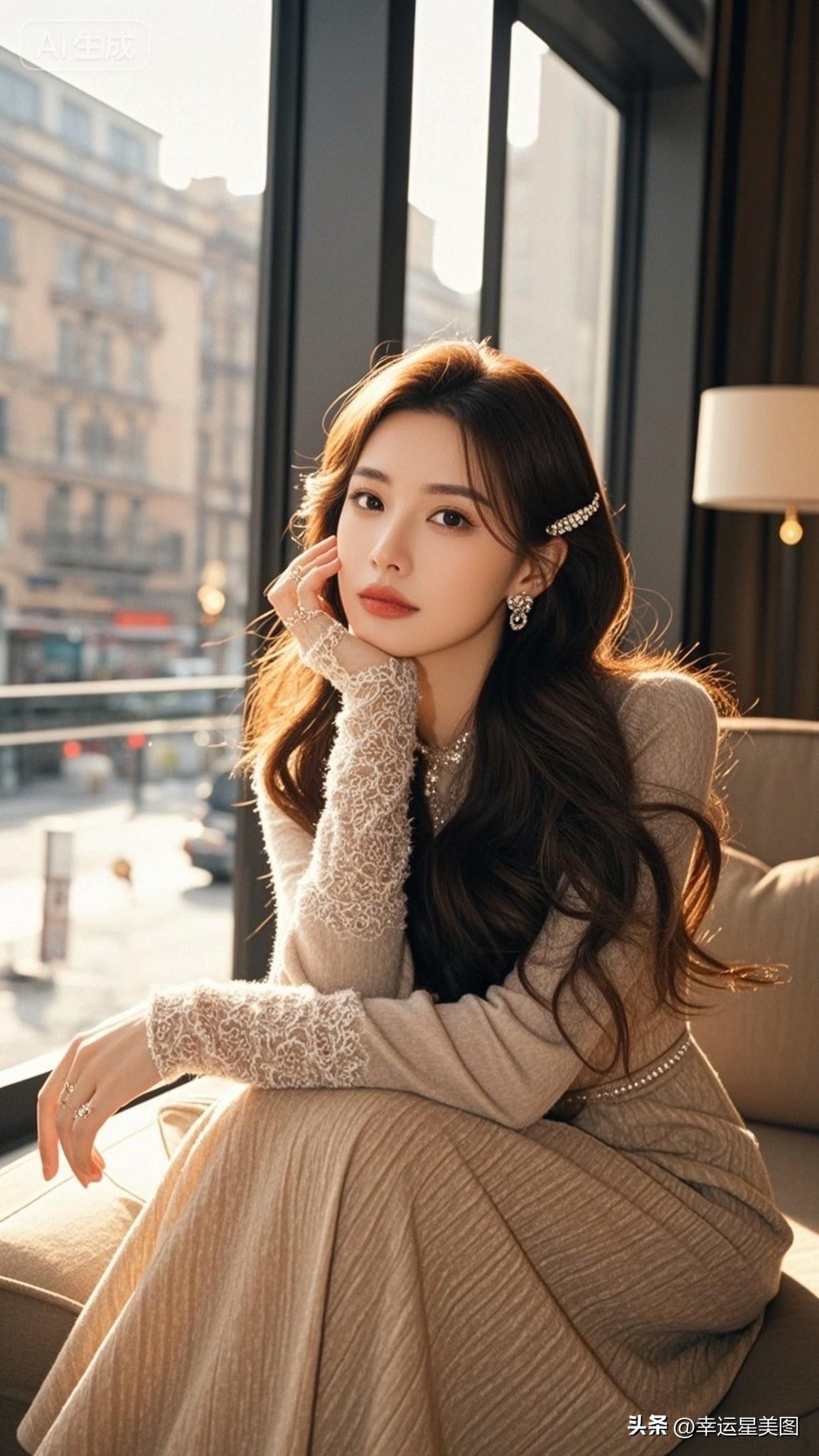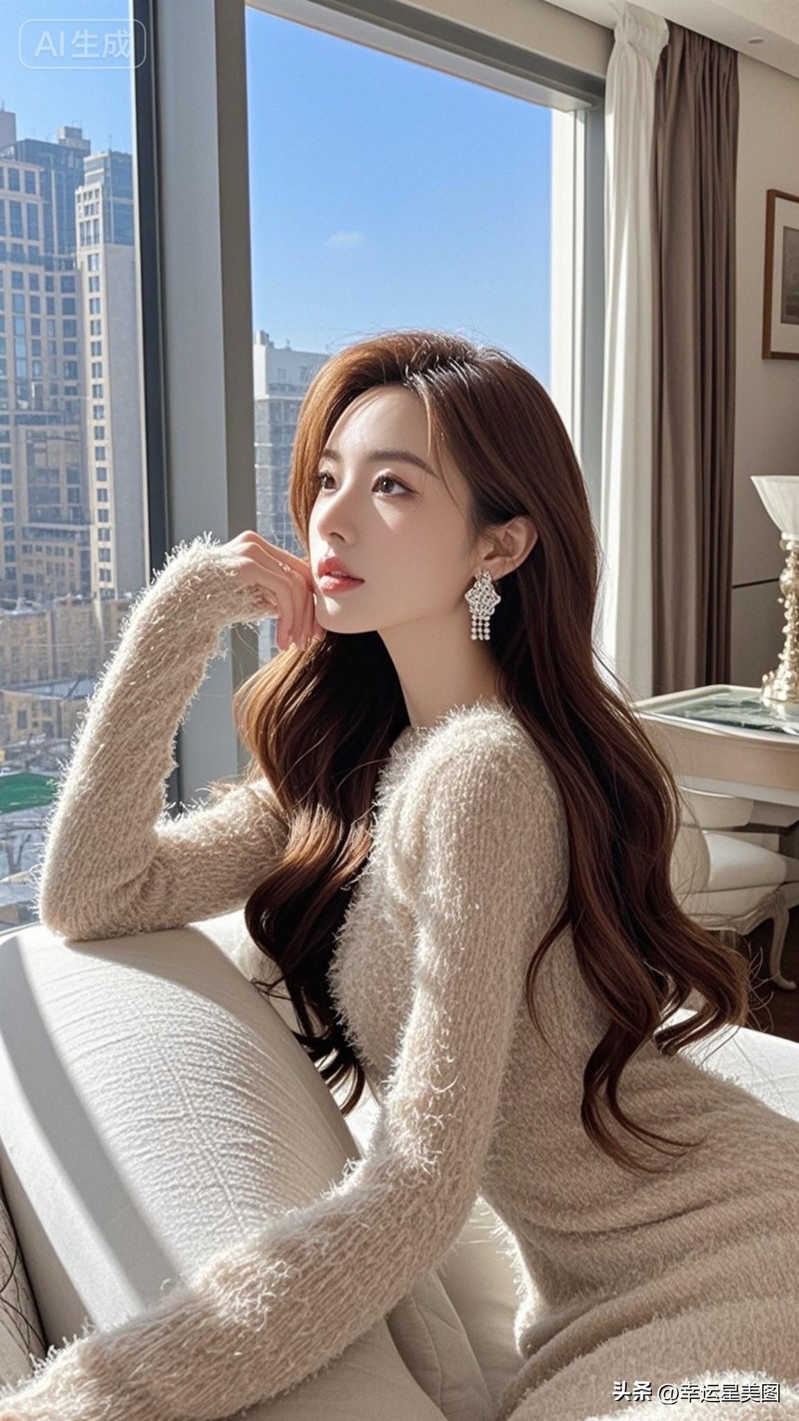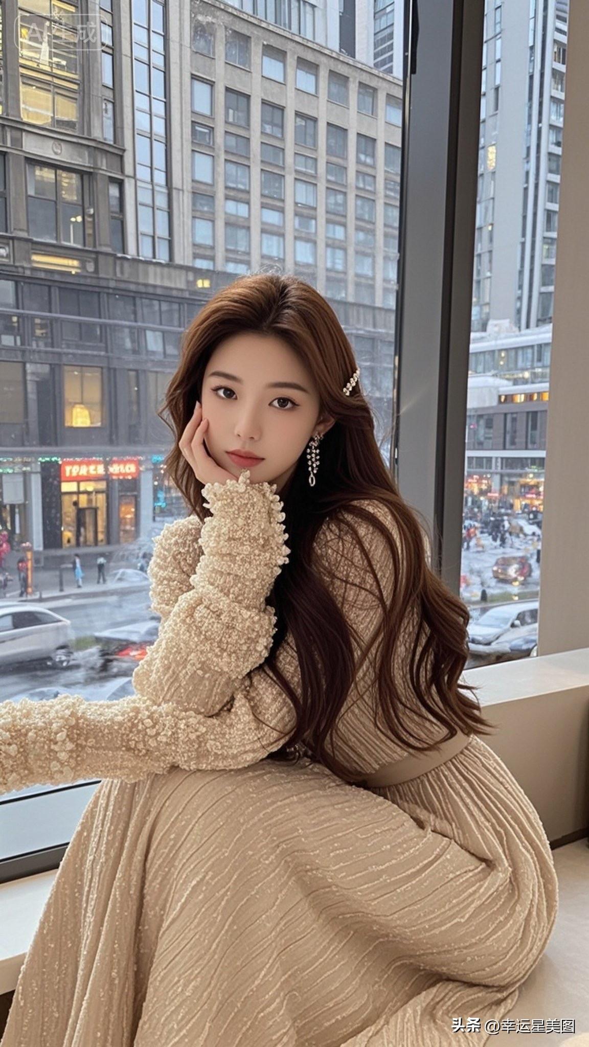 窗边沉思的优雅女子,城市喧嚣中的宁静时刻。