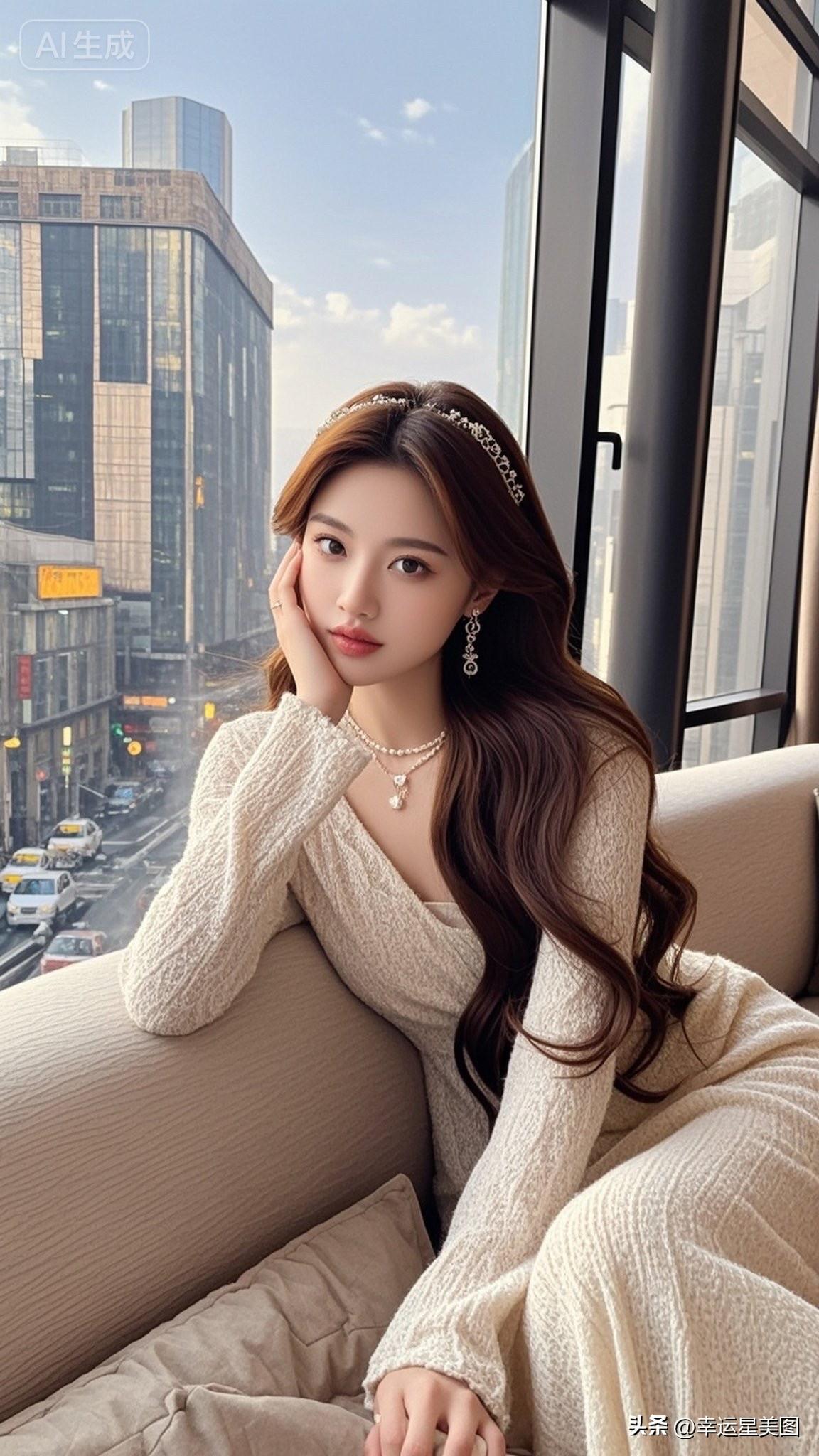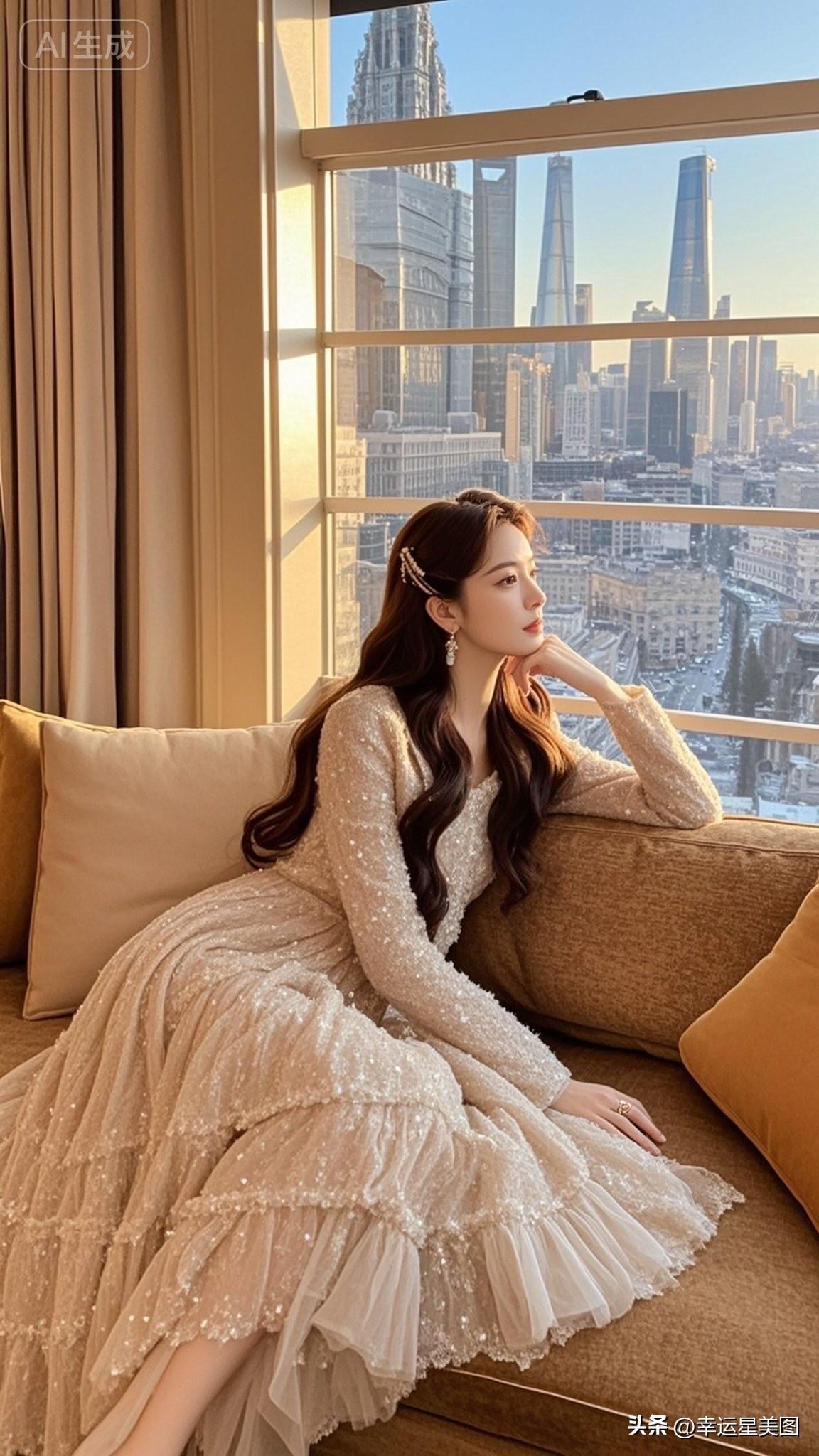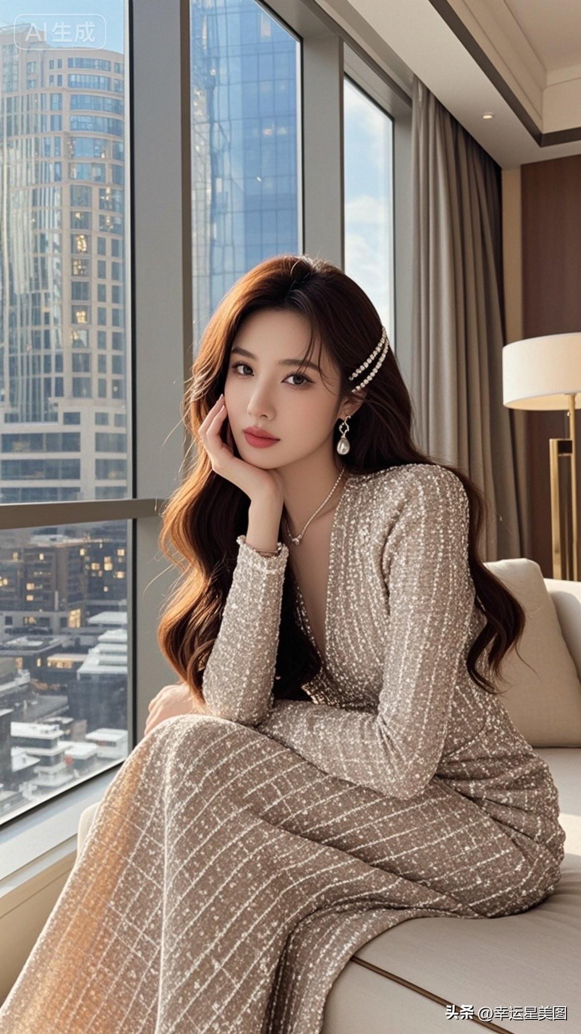 窗边沉思的优雅女子,城市喧嚣中的宁静时刻。