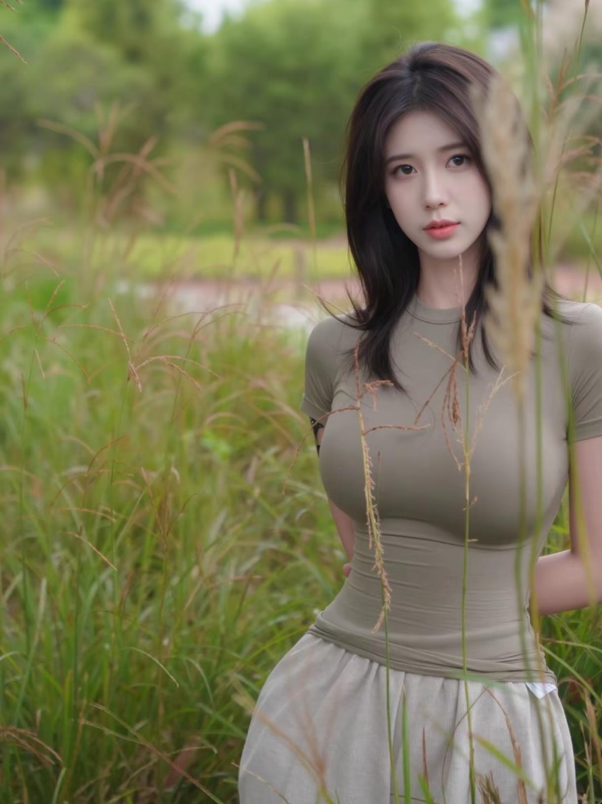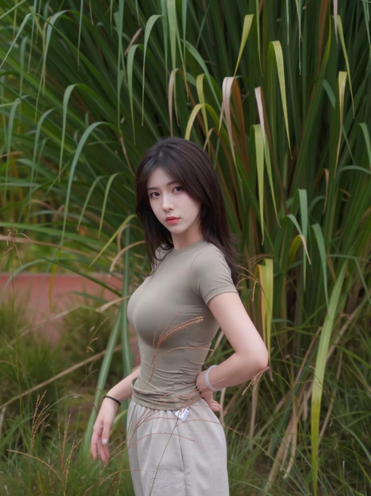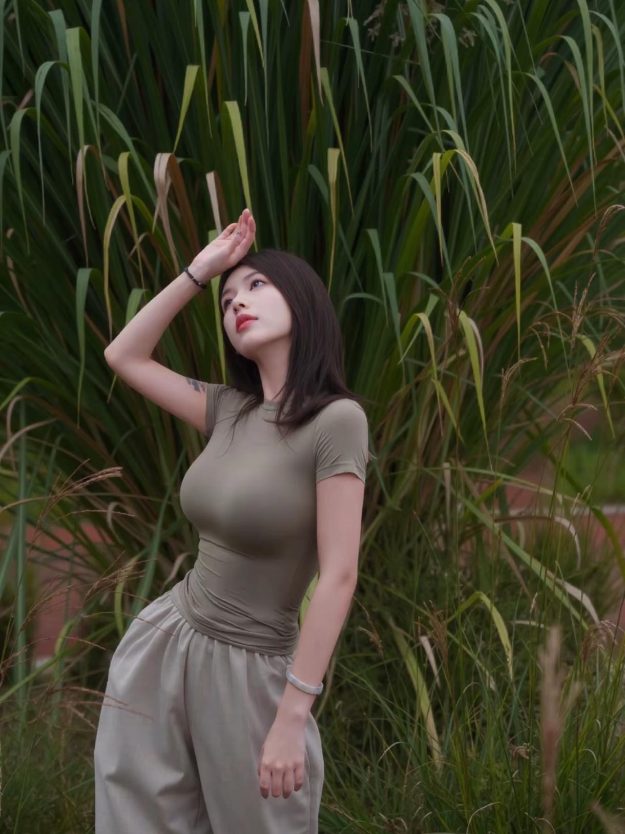 收腰短袖配阔腿裤,真的是藏在松弛感里的小心机✨ 现在越来越爱这种“看起来随便穿,其实处处藏小心思”的搭配。 橄榄绿短款上衣刚好卡在腰线,下摆随手打个结,立刻把比例拉得刚刚好。 再配一条米灰色高腰阔腿裤,垂感够好,走路带风还藏肉,脚上踩双低帮白鞋,舒服又利落。 站在芦苇丛里拍照,风一吹,连影子都跟着晃,整个人都透着随性又精致的劲儿。穿搭