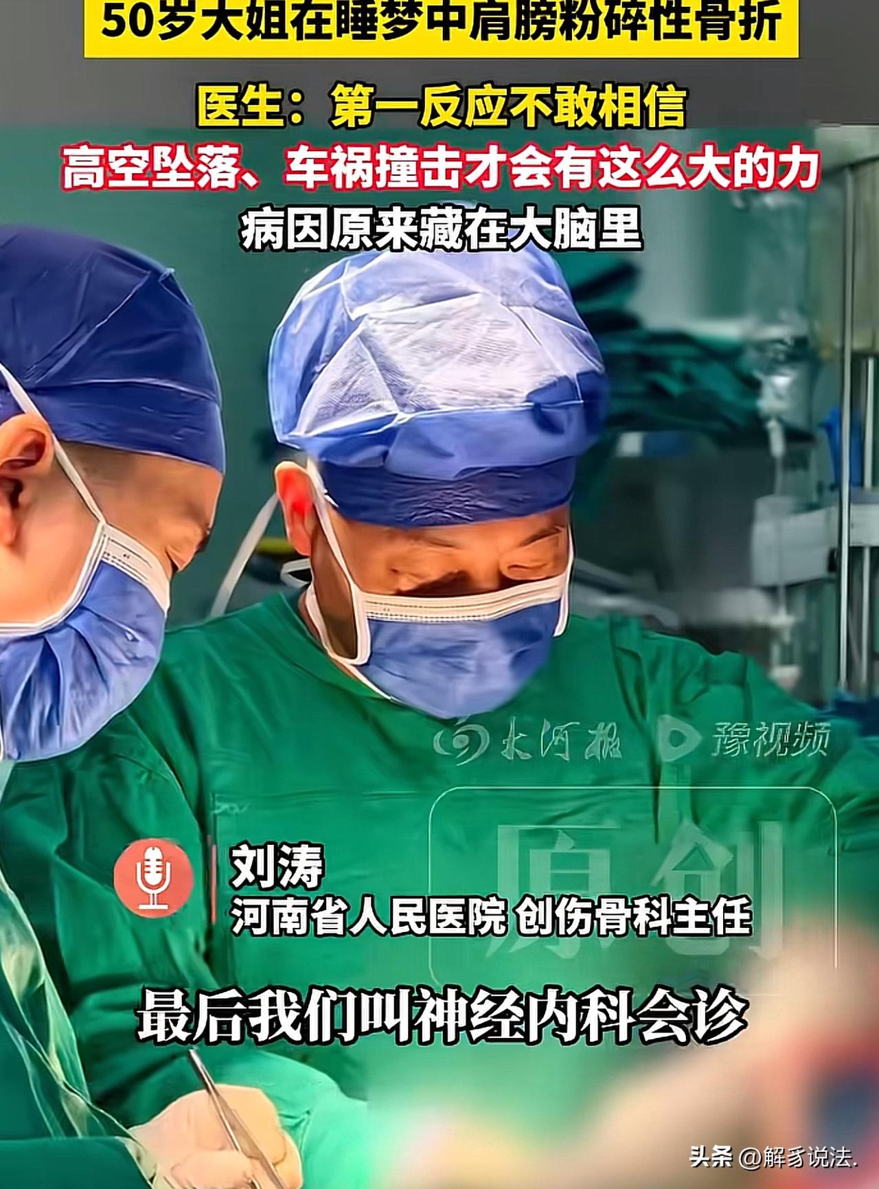 河南,50岁女子,竟在睡梦中粉碎性骨折,肩膀骨头离奇碎成7、8块。丈夫说:妻子整晚都在床上睡觉,没摔倒,也没碰到。医生也震惊住了,只有高空坠落,车祸撞击才会有这么大的力?随后,医生在片子上注意到一细节,揭开真相。 谁能想到,好好睡一觉,竟然能把肩膀睡成粉碎性骨折? 50岁的张大姐就遭遇了这件怪事,直到医生揭开谜底,所有人都直呼太不可思议。 张大姐被送到医院时,右肩已经疼得完全动不了,一碰就撕心裂肺地疼。 医生赶紧安排做CT,片子一出来,在场的人都惊呆了:她的右肩骨头碎成了七八块,肱骨头彻底从关节窝里脱了出来,错位十分严重。 这么重的伤,医生只在高空坠落、车祸撞击的病人身上见过,可张大姐明明是睡在床上出事的,没摔、没碰、没喝酒,连床都没下,怎么会伤得这么重? 因为伤势太重,她立刻被转到了河南省人民医院,医生一边准备紧急手术,一边心里满是疑问:这股能把骨头震碎的力气,到底是哪来的? 一开始,医生怀疑是肿瘤、严重骨质疏松引起的病理性骨折,可一番检查下来,全都被排除了。 就在大家一筹莫展时,片子上一个不起眼的细节引起了注意,肩关节后脱位。 这种情况十分少见,占比还不到4%,而能造成这种损伤的,最常见的原因就是癫痫发作。 顺着这个线索往下查,真相慢慢浮出了水面。医生仔细询问才知道,张大姐这三年来,经常莫名其妙地头晕、头疼,每次就持续一两分钟,歇一歇自己就好。 她一直以为是年纪大了、累着了,压根没当回事,更没想过去检查。 神经内科医生立刻给她做了脑电图监测,结果证实:张大姐在睡觉的时候,会悄悄发生癫痫发作。 原来那天深夜,丈夫听到异响醒来时,张大姐正处于癫痫发作中,眼神发直、浑身僵硬、喊也不应。 等她缓过劲来,肩膀已经彻底毁了,癫痫发作时大脑异常放电,全身肌肉猛地剧烈收缩,这股巨大的力量顺着胳膊拉扯,硬生生把自己的肩骨拽碎,把关节拽脱了位。 很多人以为癫痫就是倒地抽筋、口吐白沫,其实像张大姐这种短暂头晕、走神的不典型发作,特别容易被忽视。 好在经过手术,医生把碎骨头一块块拼了回去,张大姐的肩膀慢慢恢复了。 这件事也给所有人提了个醒:身体出现不明原因的小毛病,千万别不当回事,不起眼的症状,可能藏着大危险。 此事曝光后,网友在评论区也分享了身边发生的类似离奇事件。 是太胖了自己压碎的,我老公有一次胸部疼,转方向盘都有问题,去医院检查肋骨骨折,百思不得其解,我怀疑就是他自己睡觉压的。 我表哥睡觉侧压胳膊,胳膊骨折了,三个月都没好,长期吃素。 我家乡有一位四十七岁的男子,在炕上睡觉时,翻个身,从羊毛毡上翻了下来,结果左大腿粉碎性骨折,谁能解释一下这情况? @解豸说法.