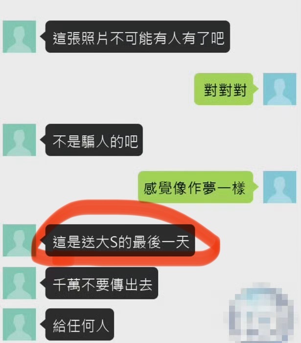 小S老公许雅钧私联大S粉丝,还发了大S的出殡照片传给对方,并提醒粉丝“这是送大S的最后一天,千万不要传出去。”许雅钧果然是狗改不了吃屎! 曝许雅钧给粉丝发大S出殡照片