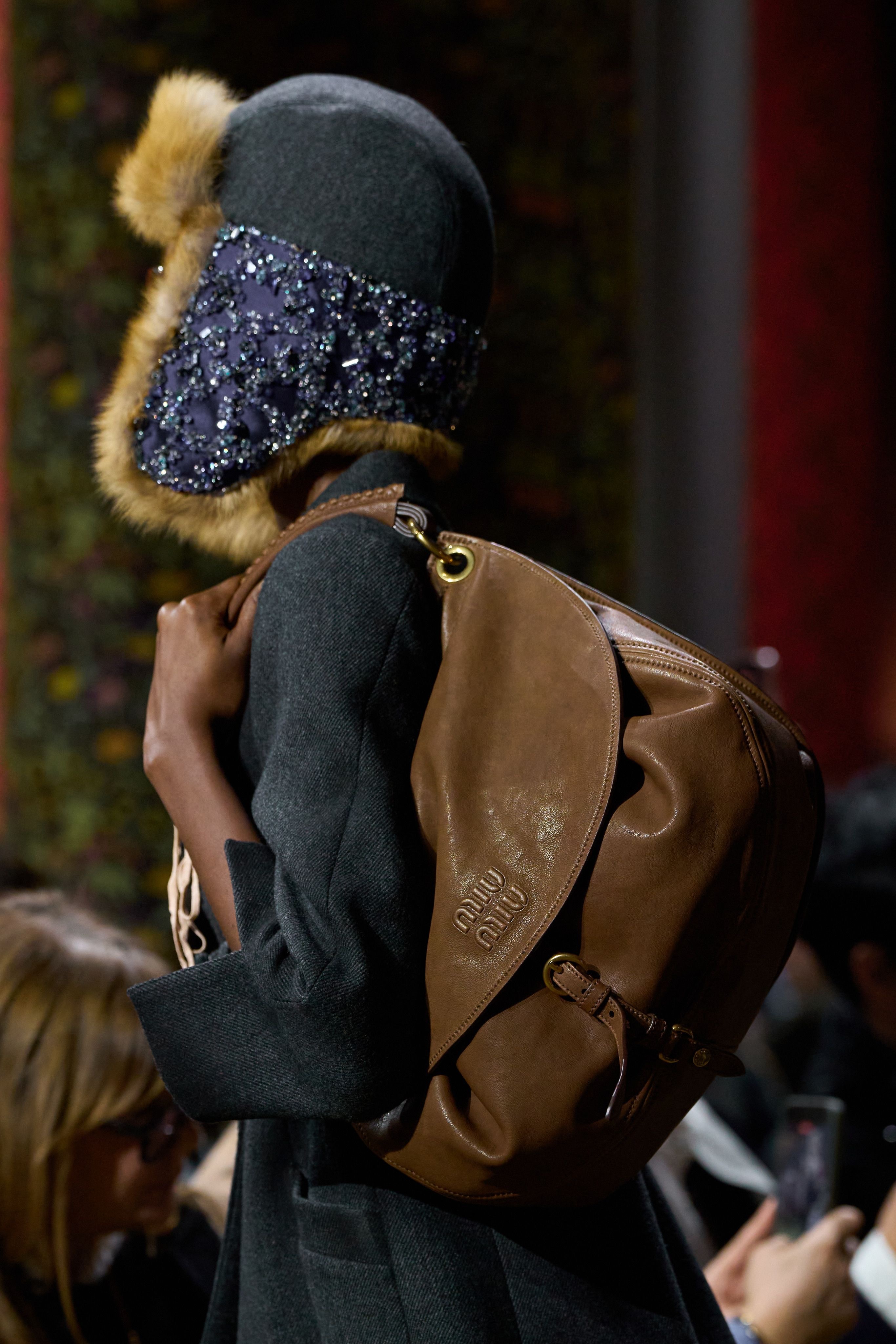 毛绒元素开场,模特头顶的毛帽,不仅厚实奢华,更为俐落的外套与简约造型增添了趣味与视觉亮点。抽绳手袋也升级为毛毛版本,为秋冬造型注入温暖又时髦的细节。