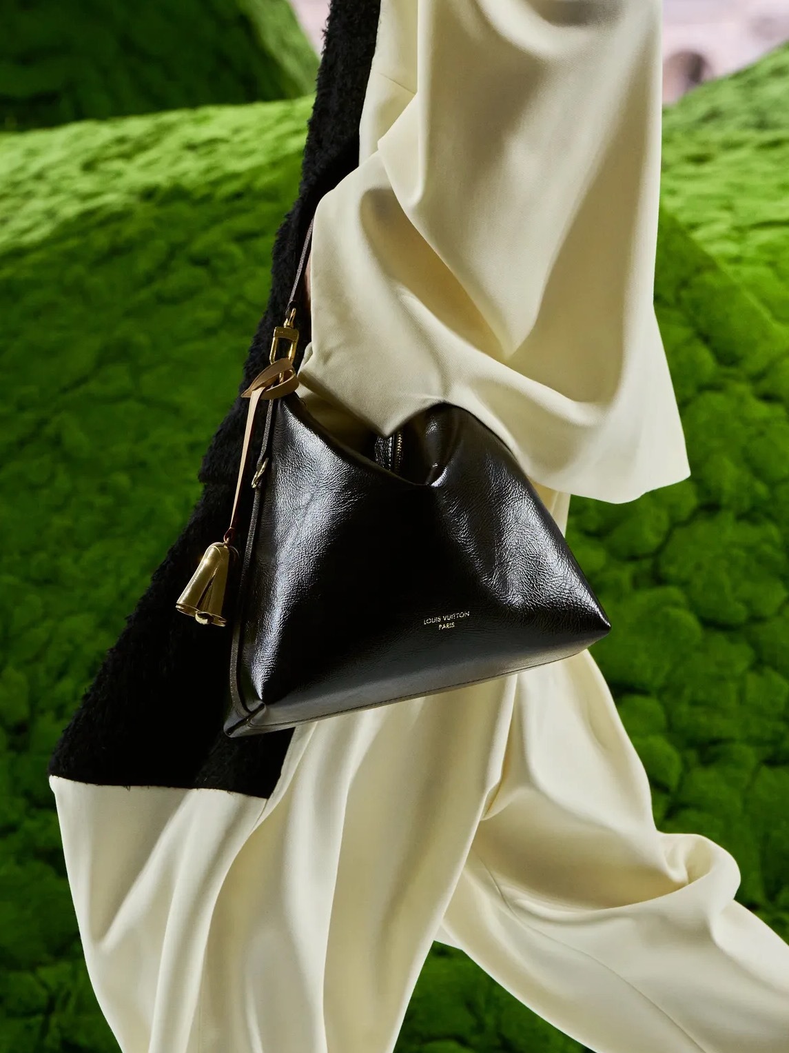 本季包袋设计成为系列中最具象征意味的部分:经典 Noé 手袋复刻自1932年原版,以更纯粹的结构回归品牌历史;珠饰细节则融入旅行箱标志性的铆钉元素,将行李箱工艺转化为装饰语言,延续 Louis Vuitton 一贯的游牧精神与手工传统。